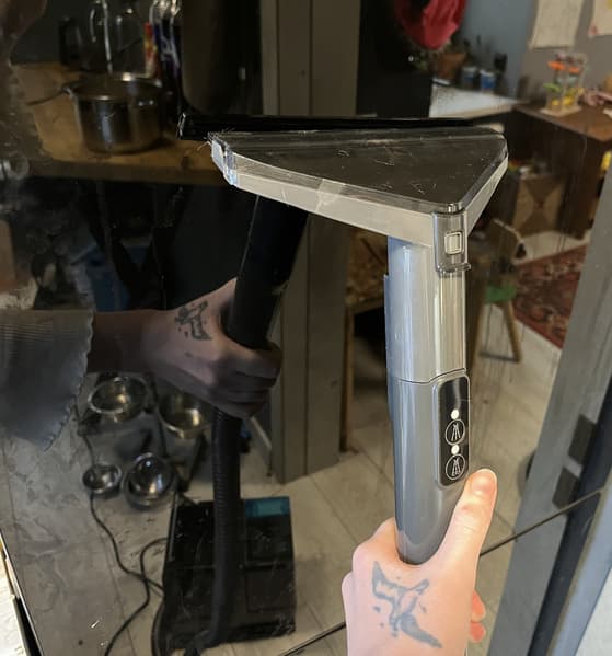 Также, как можно видеть на фотографии ниже, нам пришлось поднять пылесос на стул, чтобы помыть холодильник целиком, но даже в таком положении мы едва доставали до верхней границы дверцы. Хотелось бы, чтобы шланг у прибора был подлиннее. Мыть окна с такой длиной шланга было бы действительно неудобно.