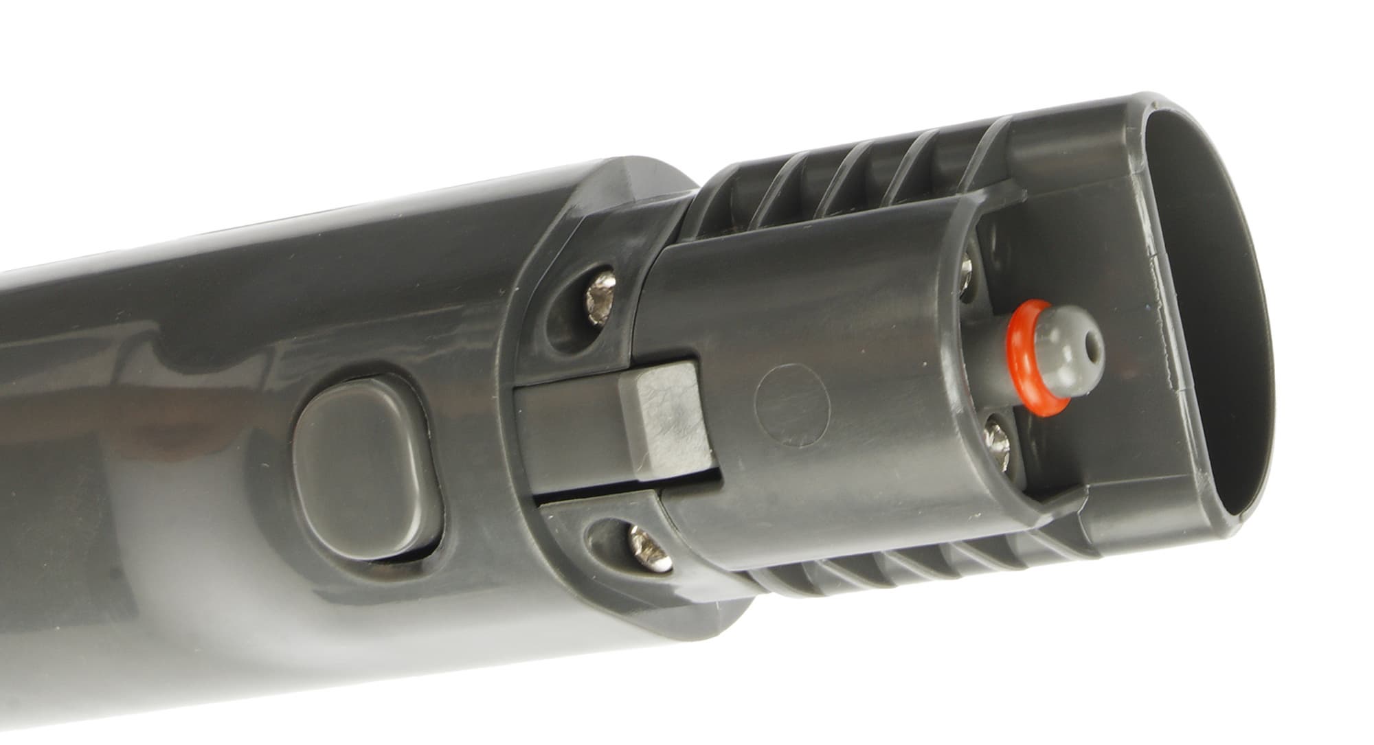 На конце рукоятке расположено место крепления съемных насадок. Также здесь мы видим сопло для выхода жидкости. Насадки надежно защелкиваются при полной установке и отщелкиваются путем нажатия на серую кнопку в нижней части рукоятки.