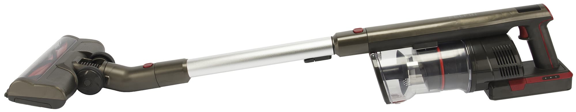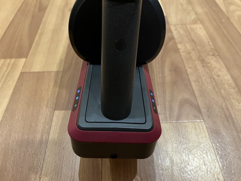 Моторный блок пылесоса оснащен ручкой пистолетного типа. При держании ручки указательный палец ложится на курок, которым запускается пылесос, остальные пальцы располагаются ниже специального выступа и удерживают саму ручку пылесоса. На вершине ручки находятся три черные кнопки управления режимами работы, а сверху над ними расположен небольшой светодиодный дисплей.