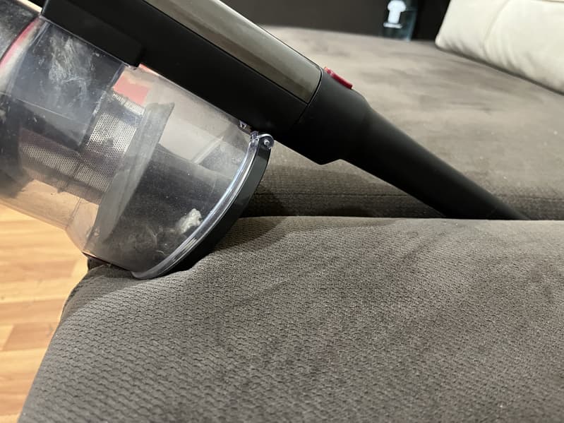 Следом мы проверили насадку «2 в 1» для деликатной уборки мебели и ковров. При использовании насадки на матрасе и диване нам удалось собрать достаточно много мелкой пыли, шерсти домашних животных и крошек. Насадка очень хорошо «присасывается» к поверхности, особенно при убранной вверх щетине и направлении вперед-назад.