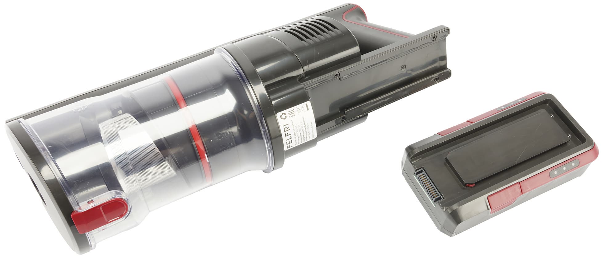 Съемный аккумулятор подключается к пылесосу 10-контактным разъемом, фиксируется одним простым движением, отстегивается при одновременном нажатии на две красные кнопки по бокам. Также по бокам аккумулятора расположены индикаторы заряда батареи, который горят белым светом и мигают во время зарядки, а по достижении полного заряда батареи — отключаются.