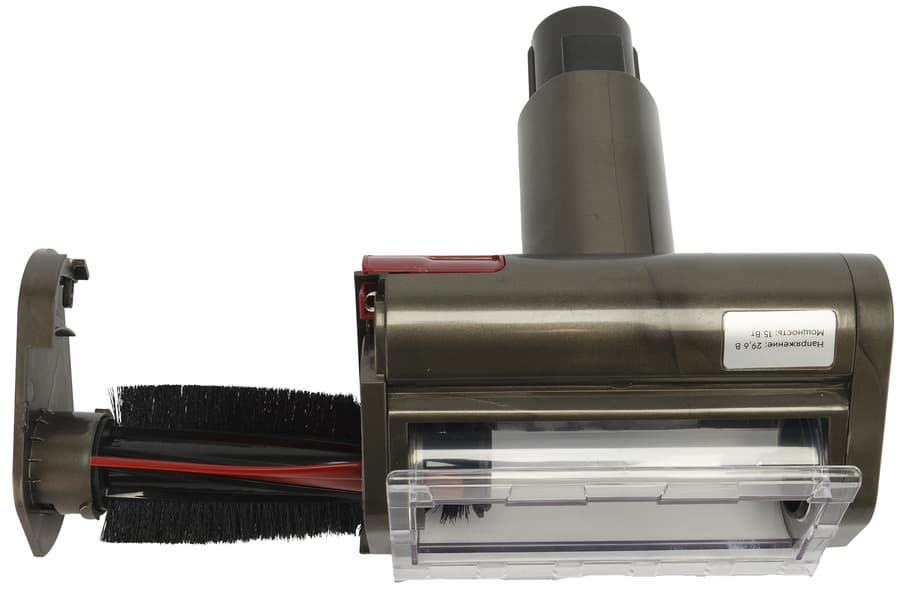 Первой рассмотрим насадку для чистки мягкой мебели, напоминающую собой мини-версию основной насадки. Эта моторизированная щетка 14,3×9 см предназначена для чистки матрасов, диванов, кресел, кроватей и т. п. Она не имеет подсветки, но в ней также установлен небольшой ротор с двумя рядами длинных щетинок и двумя резиновыми лопастями.