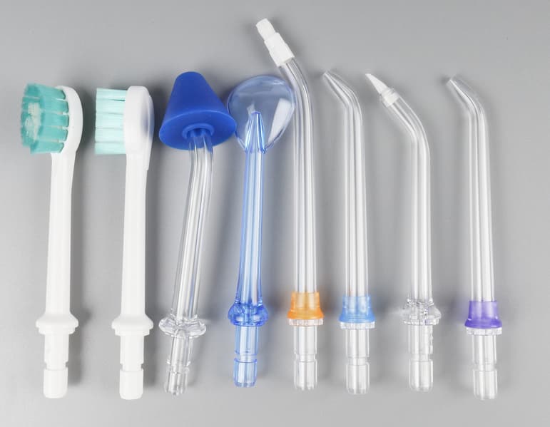 К прибору поставляется 8 насадок — 2 идентичные насадки-зубные щетки, 2 идентичные струйные насадки, которые могут использоваться для ежедневного ухода и распределяться между разными членами семьи благодаря разноцветным кольцам у основания, 1 назальная насадка для промывки носа, 1 для чистки языка, 1 ортодонтическая с щетиной, которая подойдет для ухода за брекетами, 1 пародонтологическая с мягким наконечником для чистки десенных карманов.