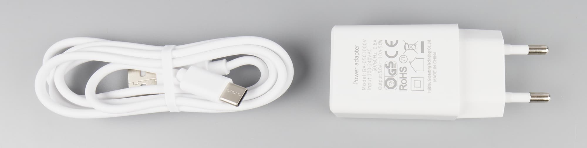 Блок питания (5 В 1 А) с проводом USB Type-C входят в комплект.