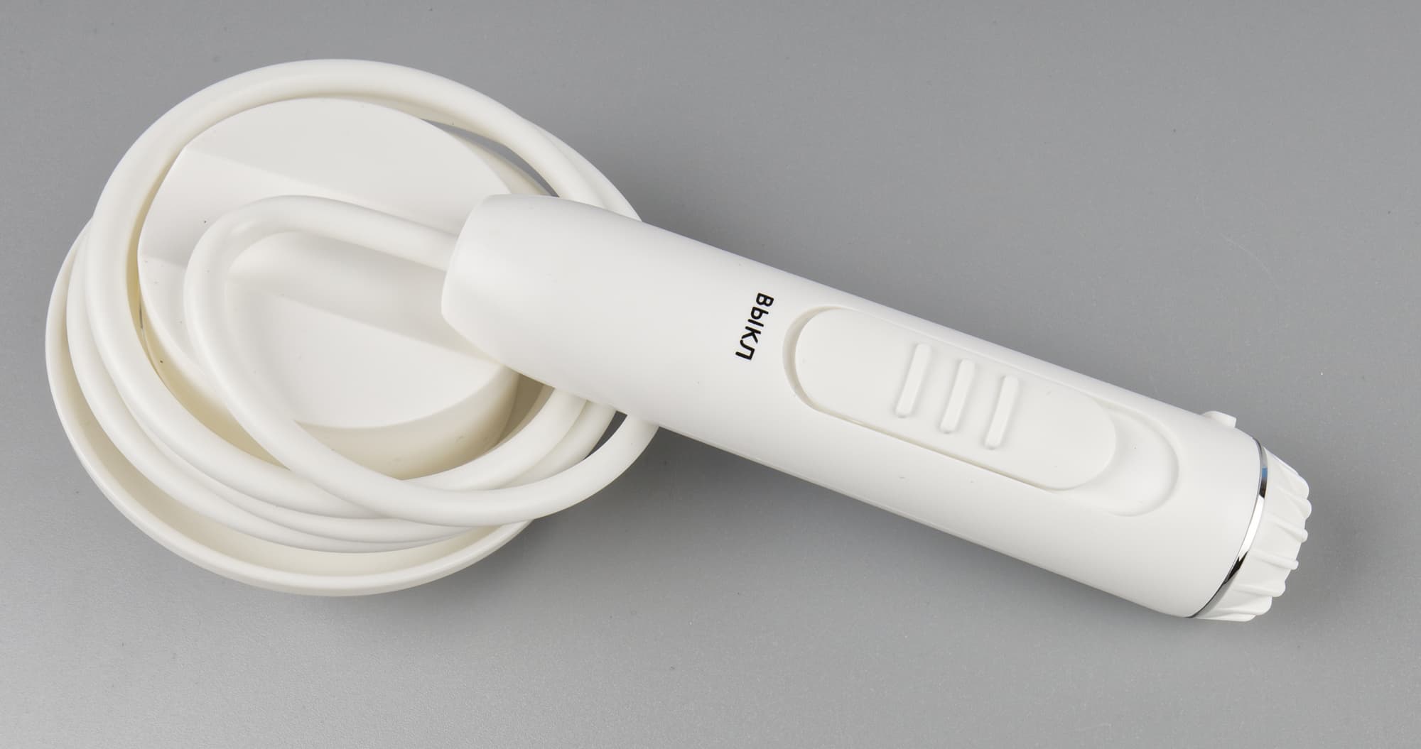Ручка устройства имеет круглое пластиковое основание с разъемом для крепления к моторному блоку с одной стороны и круглое основание поменьше с местом фиксации самой ручки, между ними находится перекладина для намотки шланга. К основанию ручка крепится благодаря магниту. Она легкая и имеет удобную для обхвата форму. В центре ручки расположен бегунок-переключатель, наверху — отверстие для насадки и кнопка для изъятия насадки, внизу — место выхода шланга для воды и сам шланг.