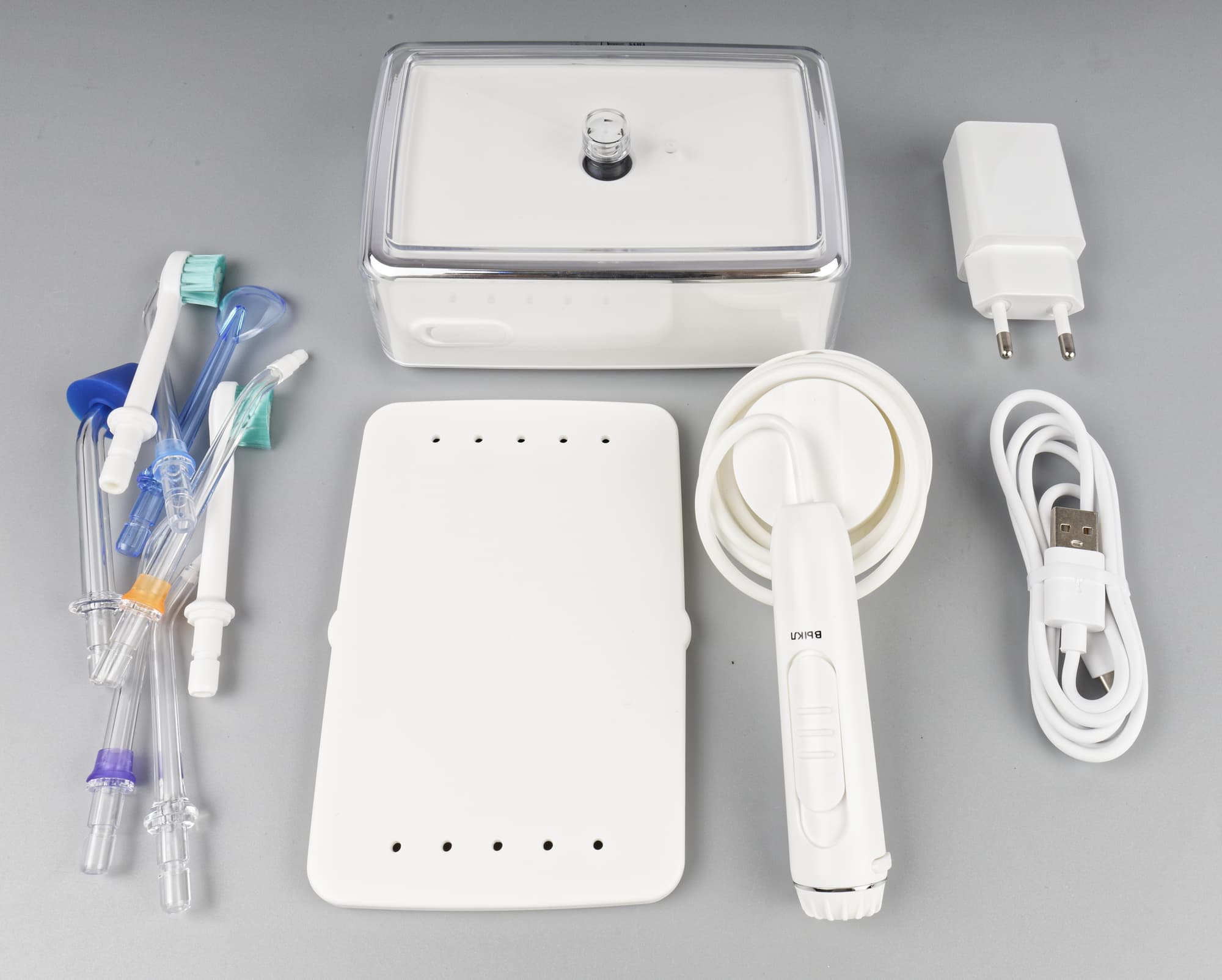 - 8 сменных насадок (струйная — 2 шт., насадка-щетка — 2 шт., ортодонтическая — 1 шт., пародонтологическая — 1 шт., для чистки языка — 1 шт., назальная насадка — 1 шт.)