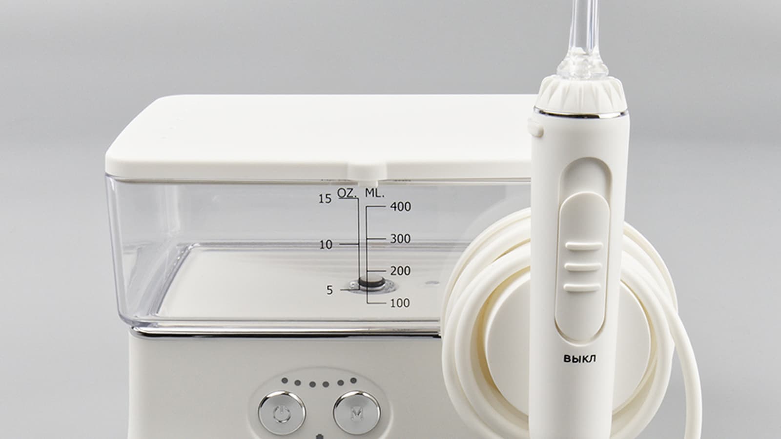 Нам понравилось, что у ирригатора есть несколько режимов давления воды, а бегунок на рукоятке позволяет приостановить подачу воды при возникновении дискомфорта и отрегулировать режим. Эти особенности могут быть важны при использовании детьми, пожилыми людьми и при кровоточивости десен.