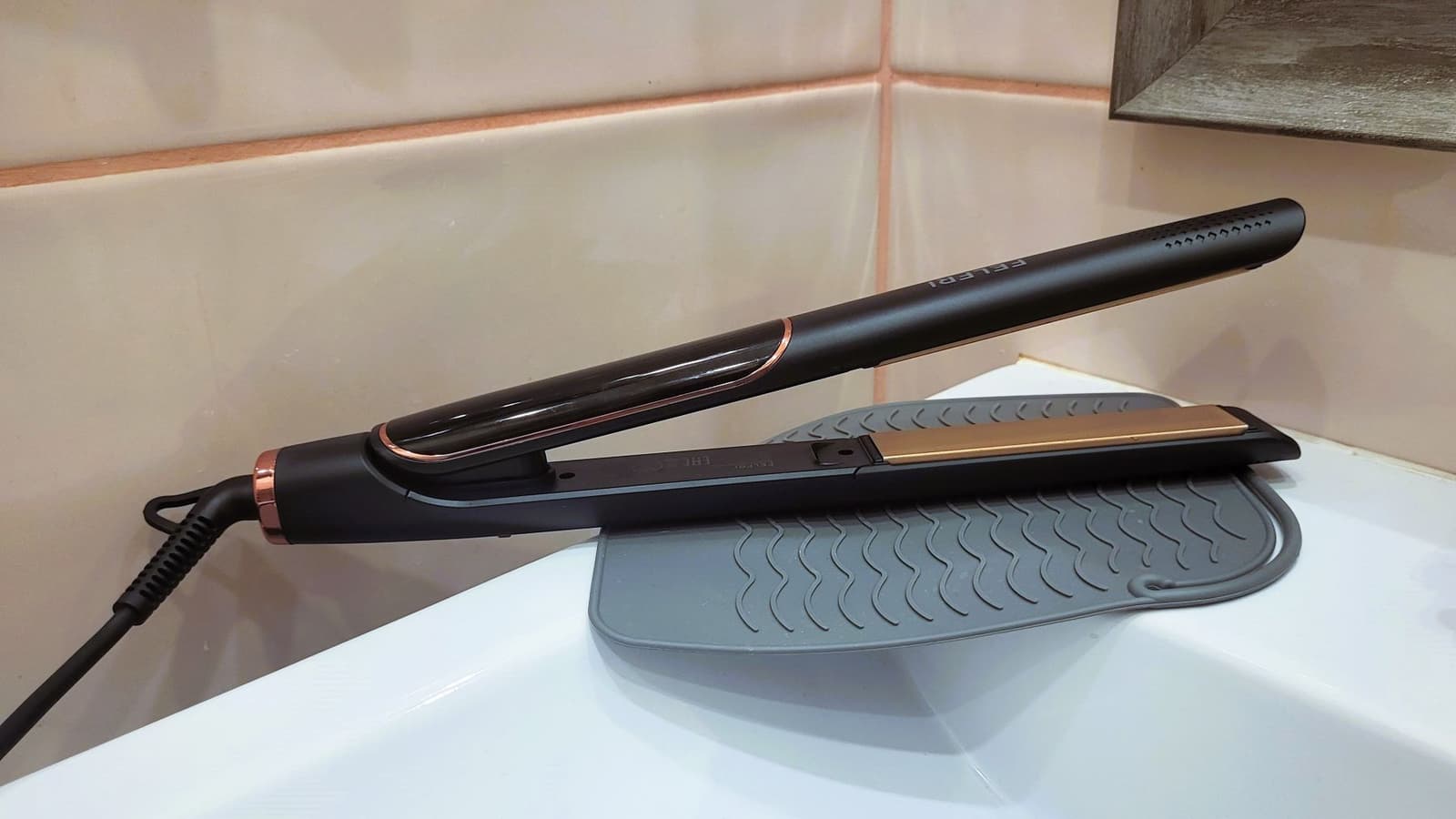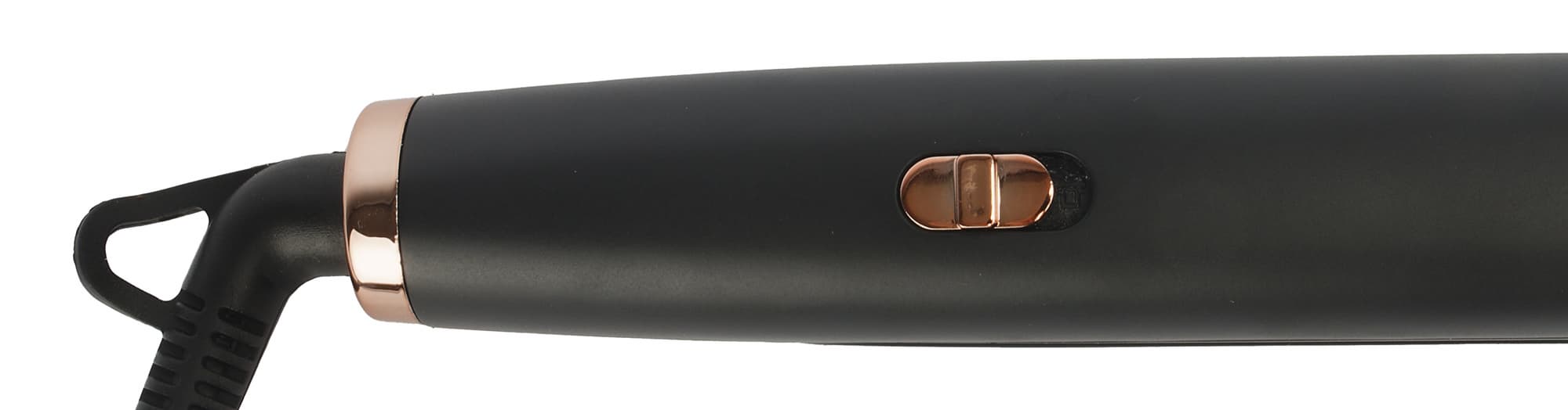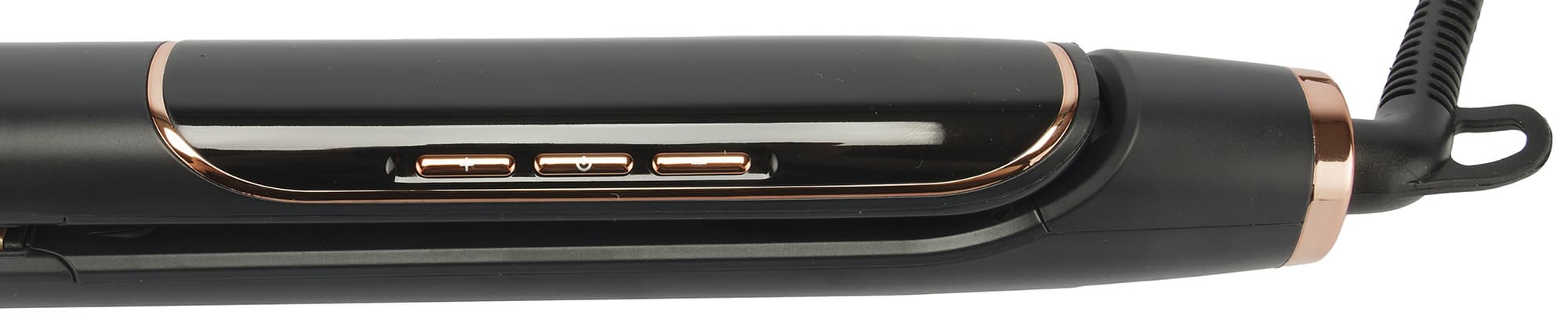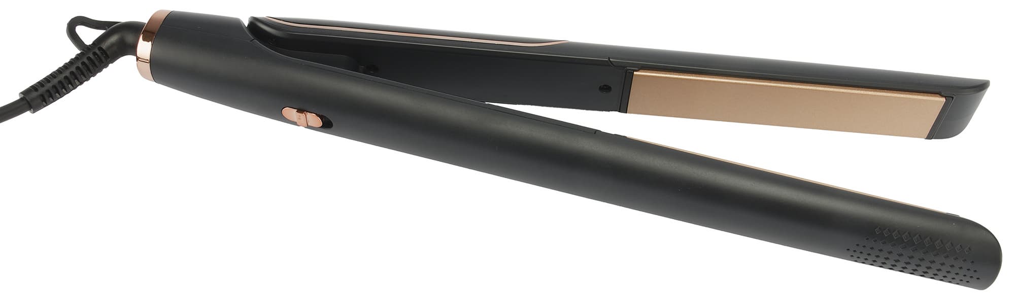 Выпрямитель классической конструкции выглядит стильно и элегантно. Корпус покрыт черным приятным на ощупь матовым пластиком и дополнен вставками медного цвета. Внутренняя поверхность и сами рабочие пластины — приглушенного бежевого цвета.