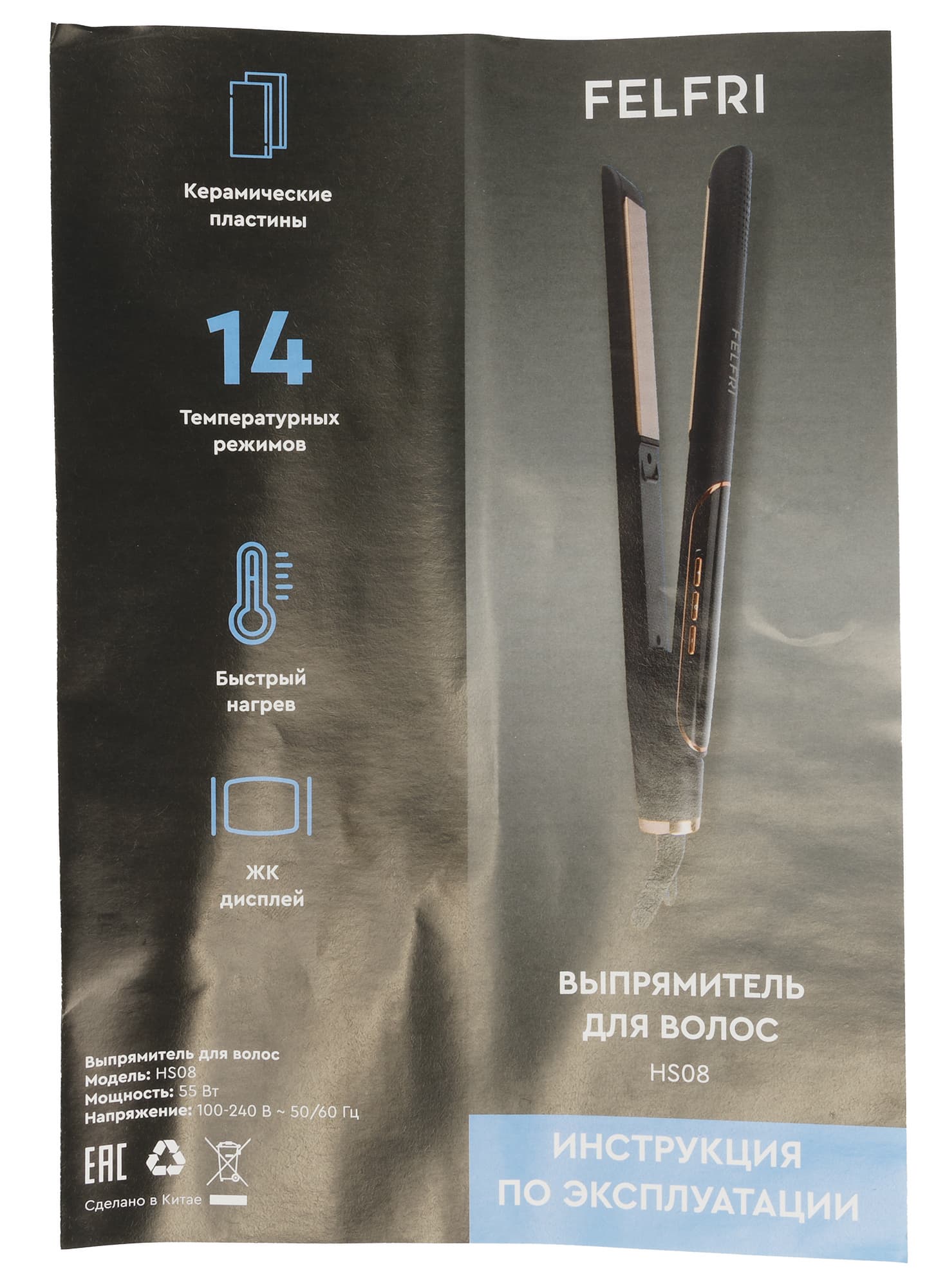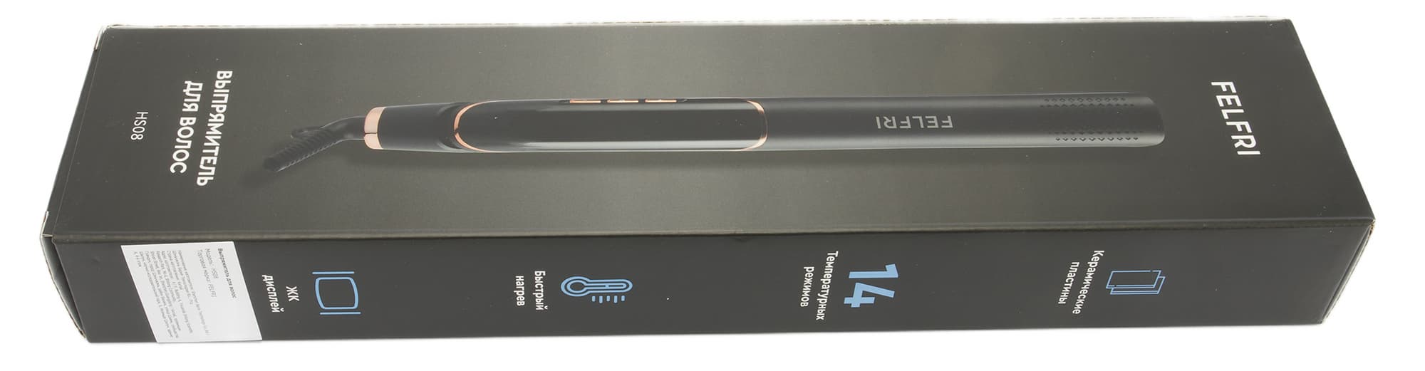 Выпрямитель Felfri HS08 упакован в небольшую картонную коробку прямоугольной формы черного цвета. На лицевой стороне размещена фотография прибора, логотип компании и наименование модели.