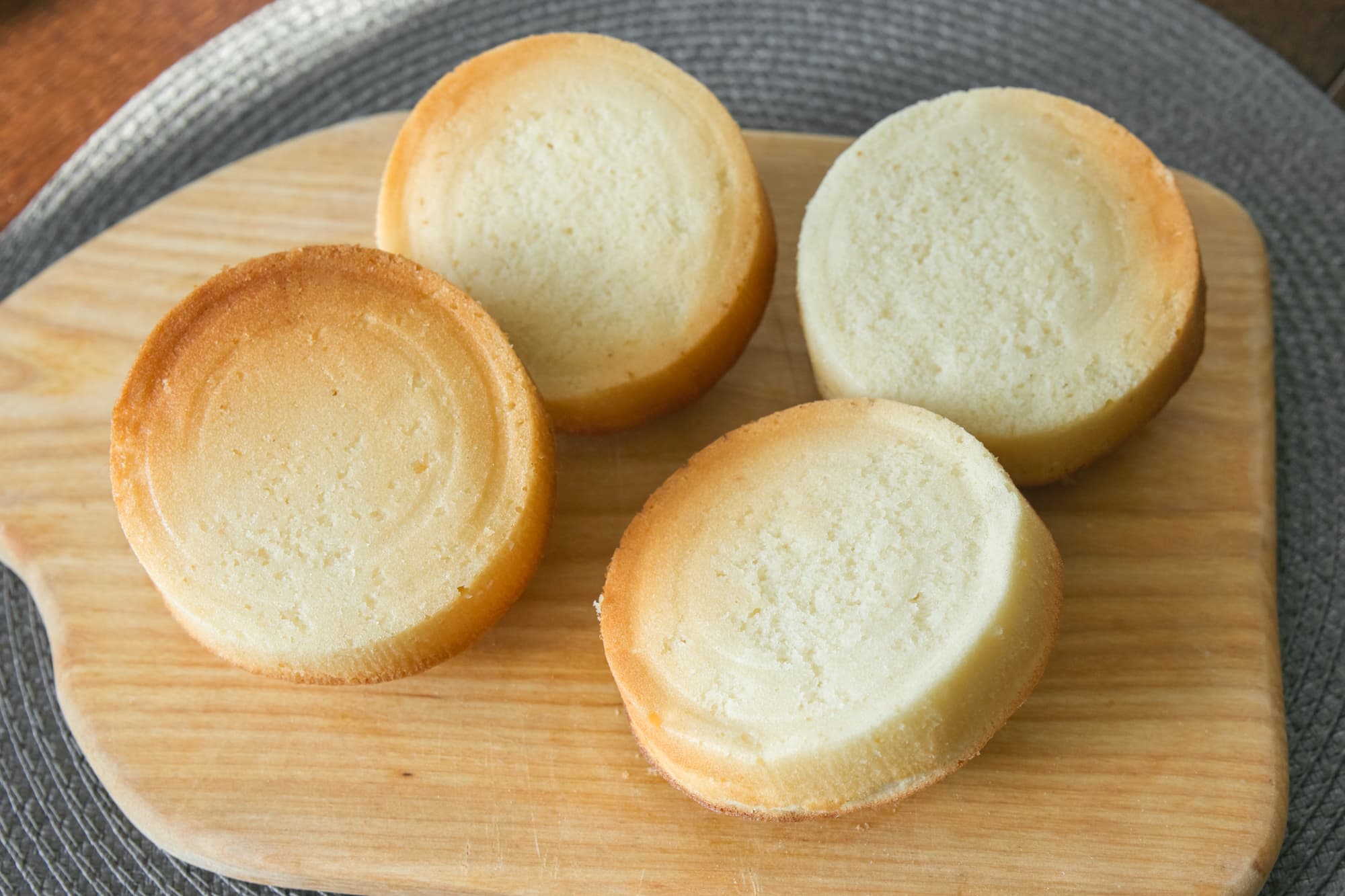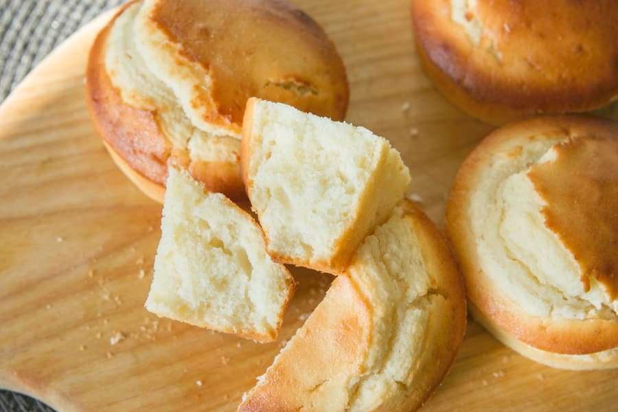Ингредиенты: мука — 130 г, разрыхлитель — 1 ч. л., сахар — 70 г, соль — щепотка, 2 крупных яйца, сливочное масло — 70 г, молоко — 110 мл, сок лимона — 2 ст. л.