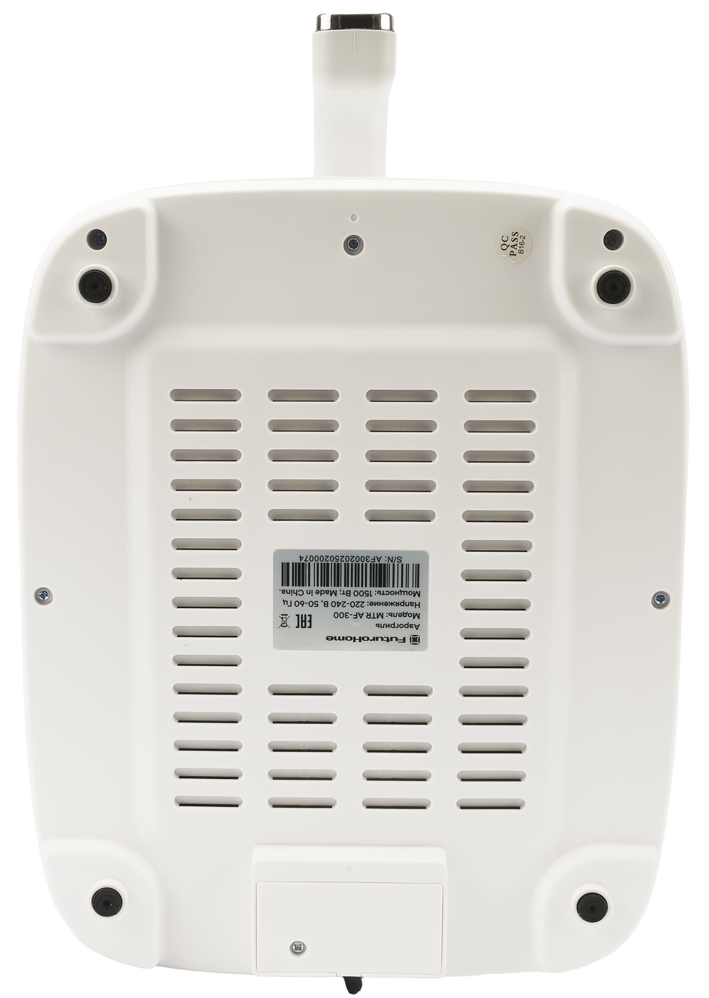 Прибор внутри упакован в полиэтилен и крепко зажат парой пенопластовых вкладок. Прорезей или ручки на коробке не оказалось. Комплект FuturoHome MTR AF-300 состоит из корпуса аэрогриля со съемной чашей, решетки, а так же документации в виде руководства, гарантийного талона и приветственного письма от производителя.