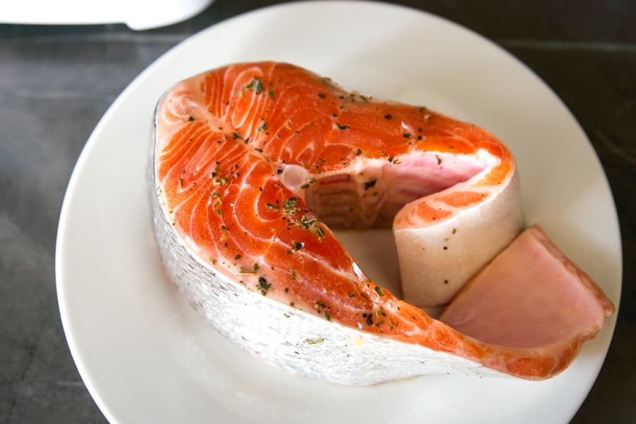 Семгу мы готовили на автоматической программе Рыба с нагревом по умолчанию — 160 °C. Время тоже оставили неизменным — 15 минут.