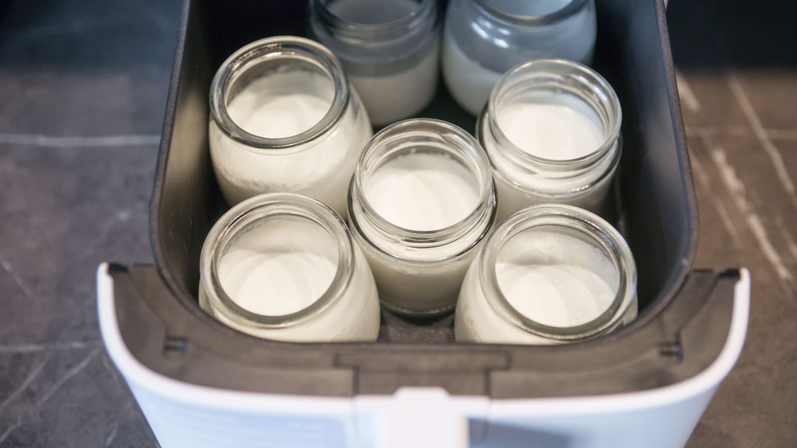 Напоследок мы проверили стабильность нагрева на низкой температуре в течение длительного времени — приготовили йогурт. Взяли 700 мл молока жирностью 3,2%, 300 мл сливок жирностью 20% и 240 г 2%-ного греческого йогурта без добавок. Молоко не подогревали. Смешали всё венчиком до однородной консистенции и разлили по баночкам. Установили их в чашу и запустили аэрогриль в режиме Йогурт на 8 часов. Предложенную температуру в 40 °C оставили без изменений. Больше к устройству не подходили и в процессе внутрь даже не заглядывали.