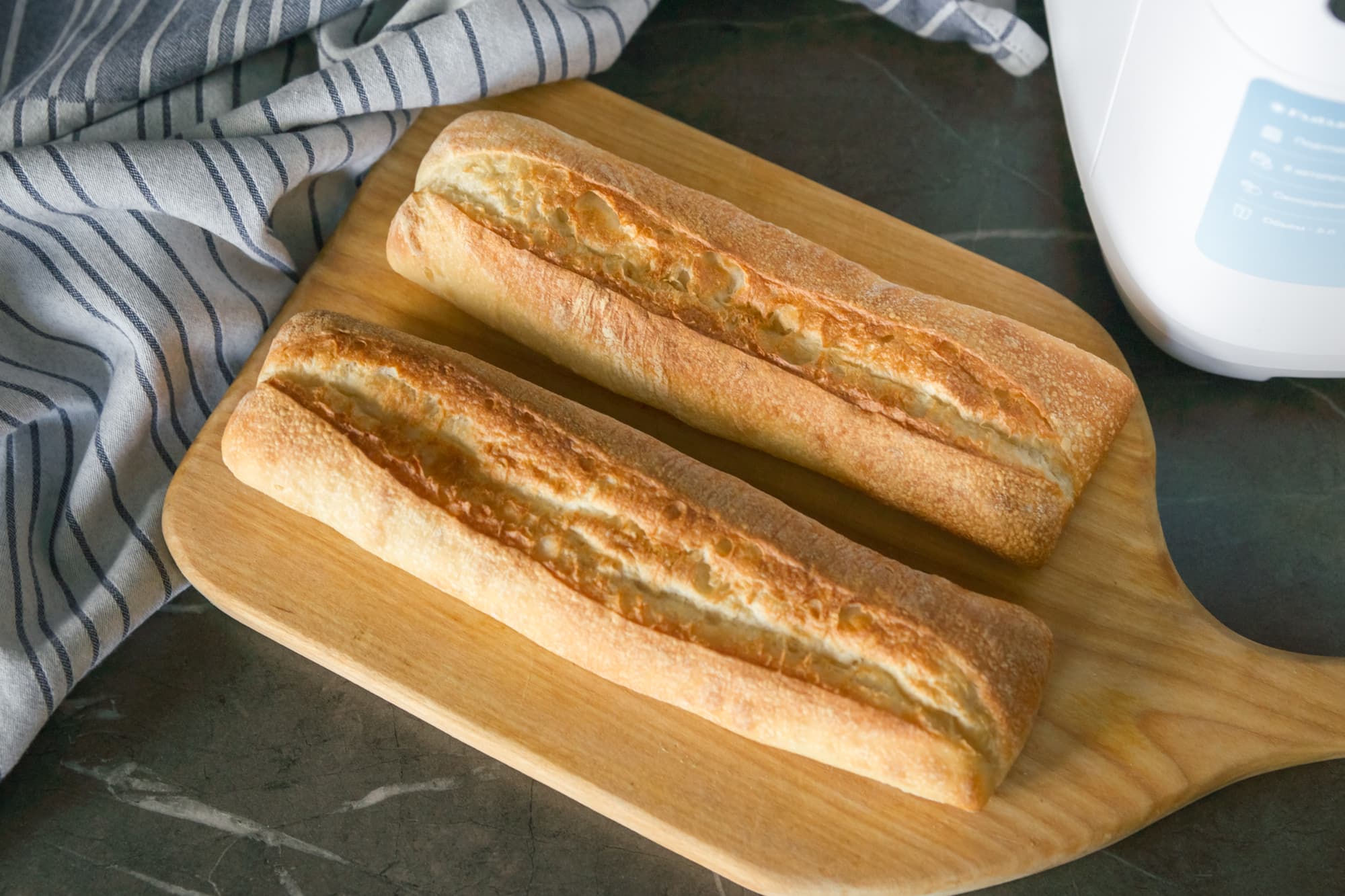 Предварительно хлеб при комнатной температуре мы не выдерживали, отправили выпекаться как есть, сразу из морозилки. В этом тесте предустановленные параметры программы Выпечка нам подошли — багеты приходили в чувство при 175 °C в течение 10 минут.