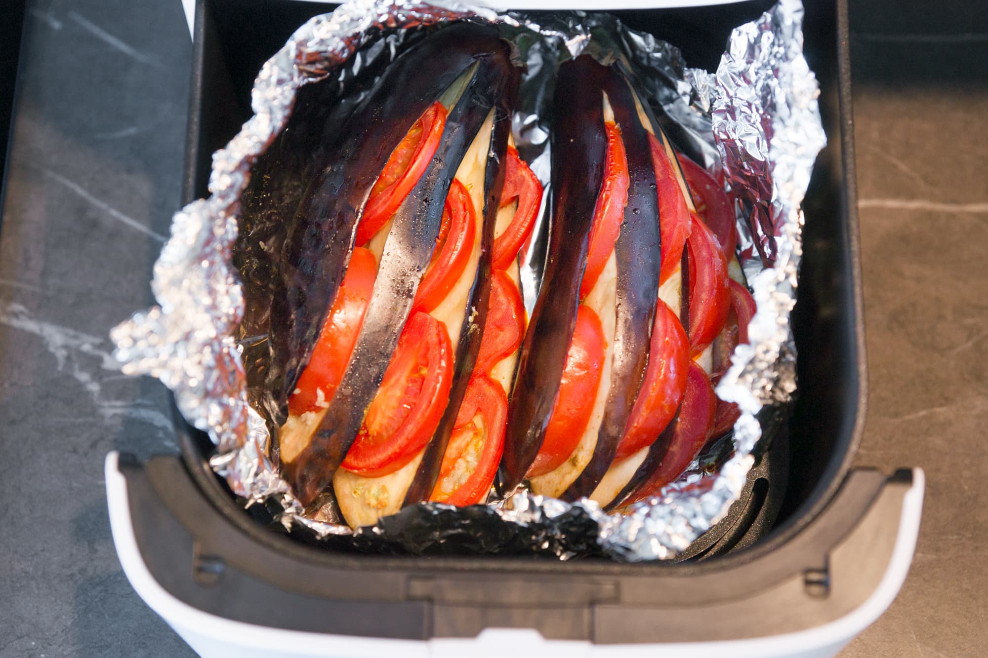Начали с овощей. Взяли пару баклажанов, нарезали их веером, натерли срезы солью со специями и давленым чесноком, вставили между пластинками кружочки помидоров, завернули в фольгу и поместили в чашу.