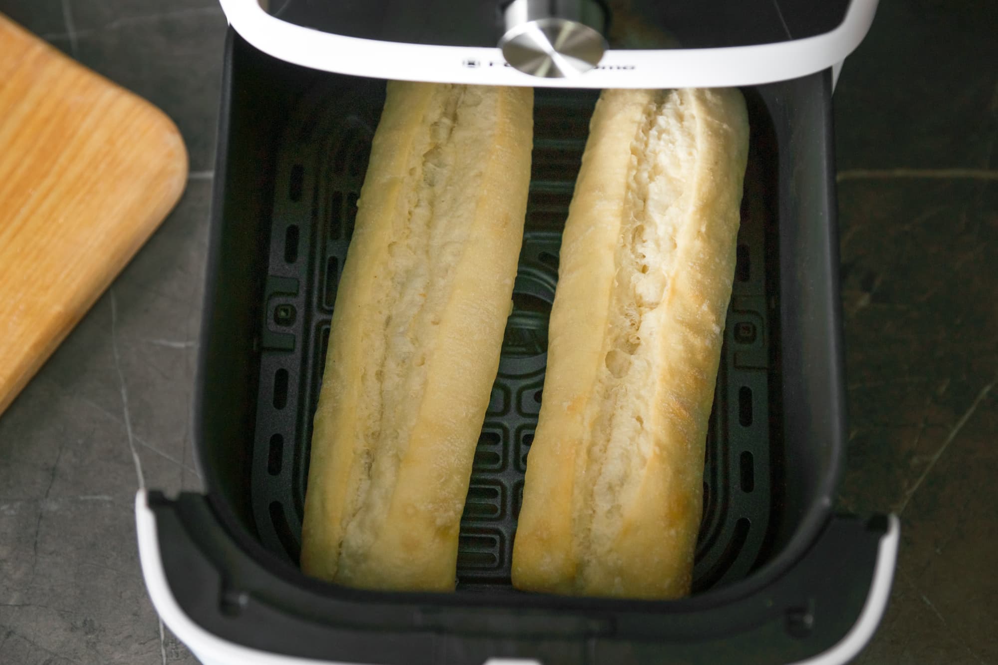 Аэрогриль превосходно подходит и для быстрого разогрева. В этом мы убедились, опустив в чашу пару замороженных багетов.