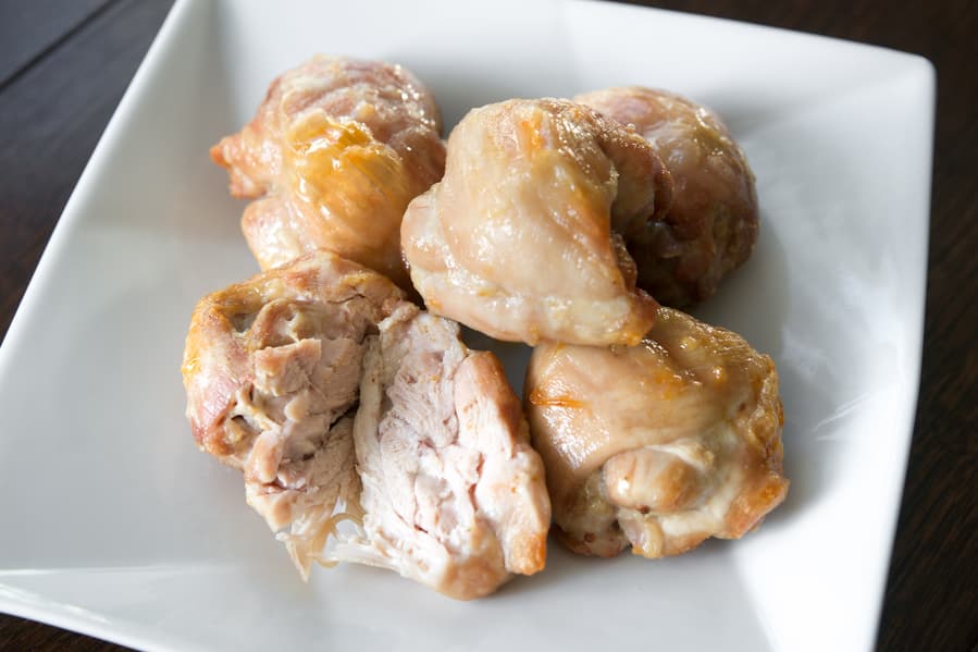 Куриные бедрышки были без кожи, поэтому, чтобы не пересушить верхушку, мы смазали ее растительным маслом.