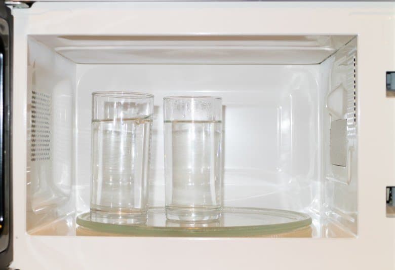 Также мы произвели тест на равномерность нагрева в разных частях камеры. Для этого мы использовали два стакана, в которые было налито 0,2 л воды с исходной температурой 14,6 °C. Затем стаканы были размещены внутри микроволновой печи следующим образом: один — в центре поворотного столика, другой — с края.