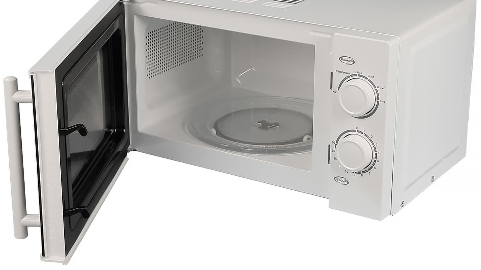 Визуальный осмотр не вызвал никаких вопросов. В наших руках оказалась самая обычная классической конструкции микроволновая печь: металлический корпус белого цвета, контрастная по цвету дверца, незатейливая панель управления, расположенная с правой стороны от дверцы.