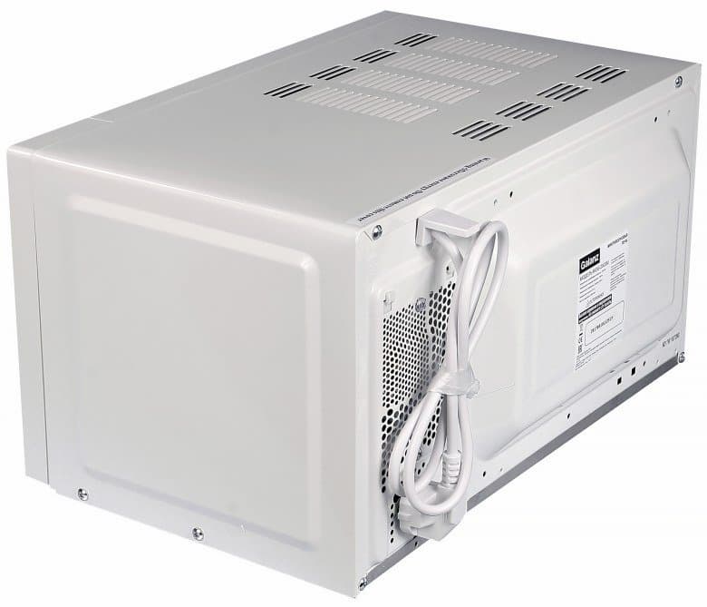Со стороны дна корпус имеет сложную форму, изобилующую выпуклостями и вогнутостями с вентиляционными отверстиями различной формы и направленности. В передней части расположены две пластиковые ножки, в задней части микроволновая печь опирается на металлические выступы.