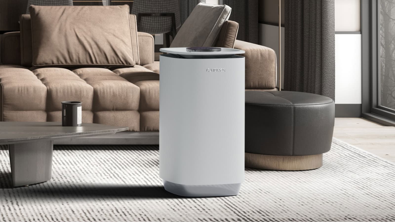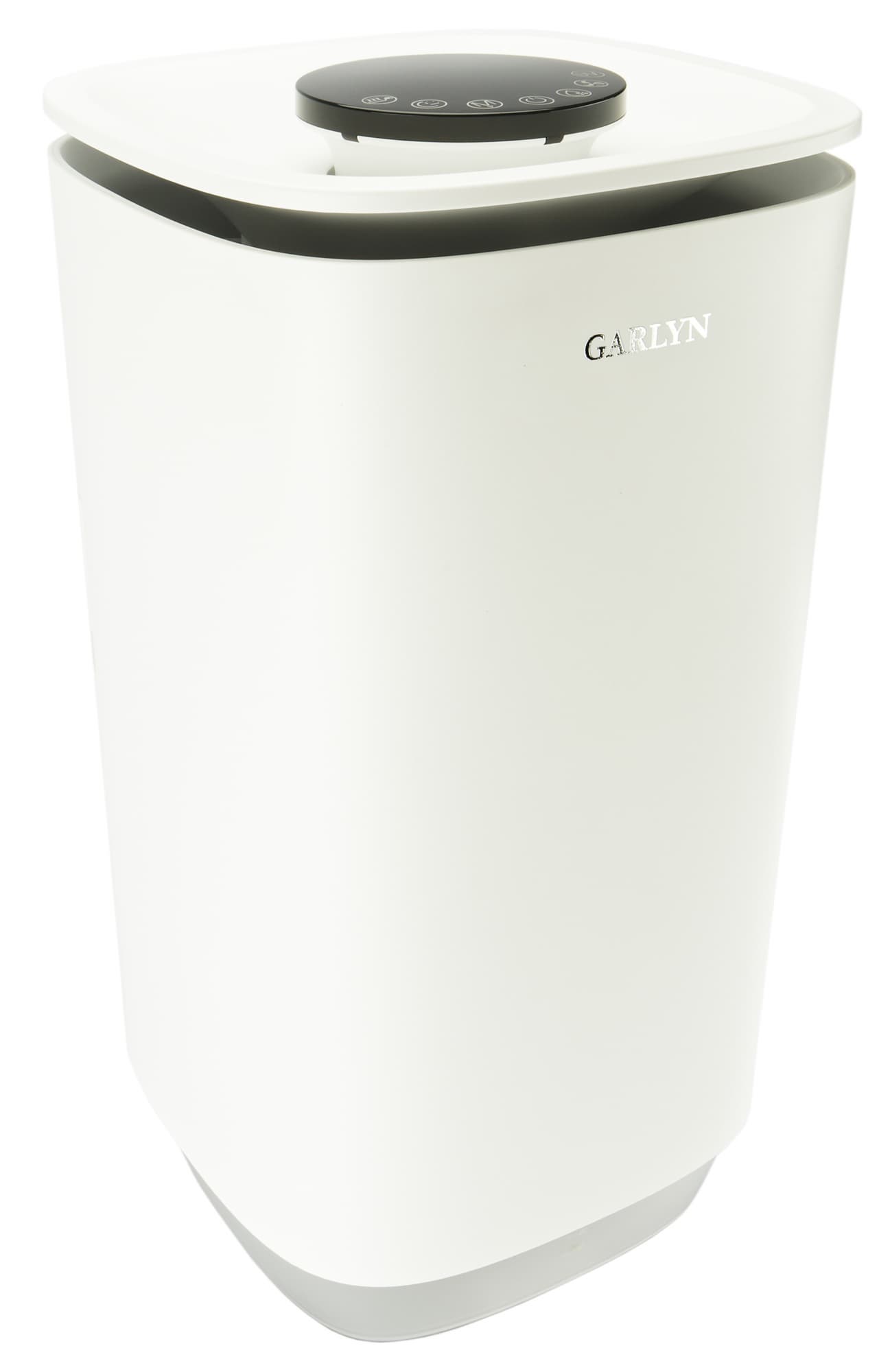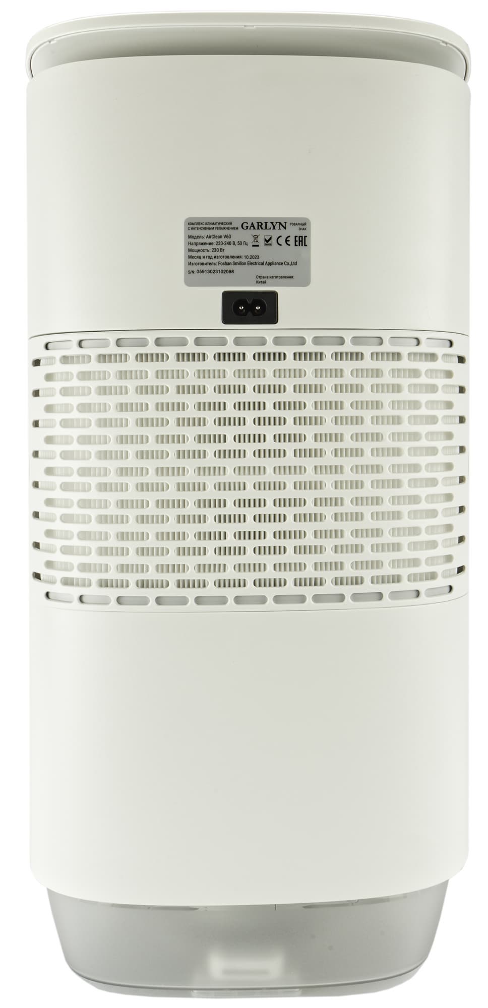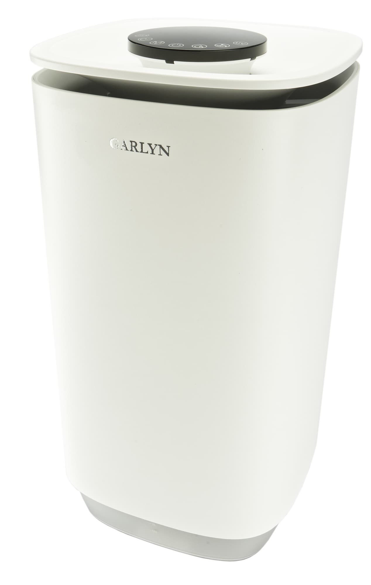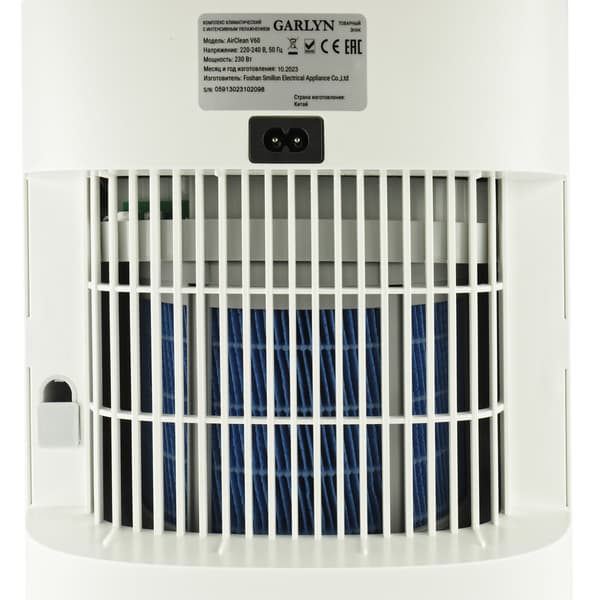 Климатический комплекс Garlyn AirClean V60 представляет собой вертикальный параллелепипед со скругленными углами, сделанный из белого матового пластика. Переднюю сторону украшает серебристый логотип производителя.
