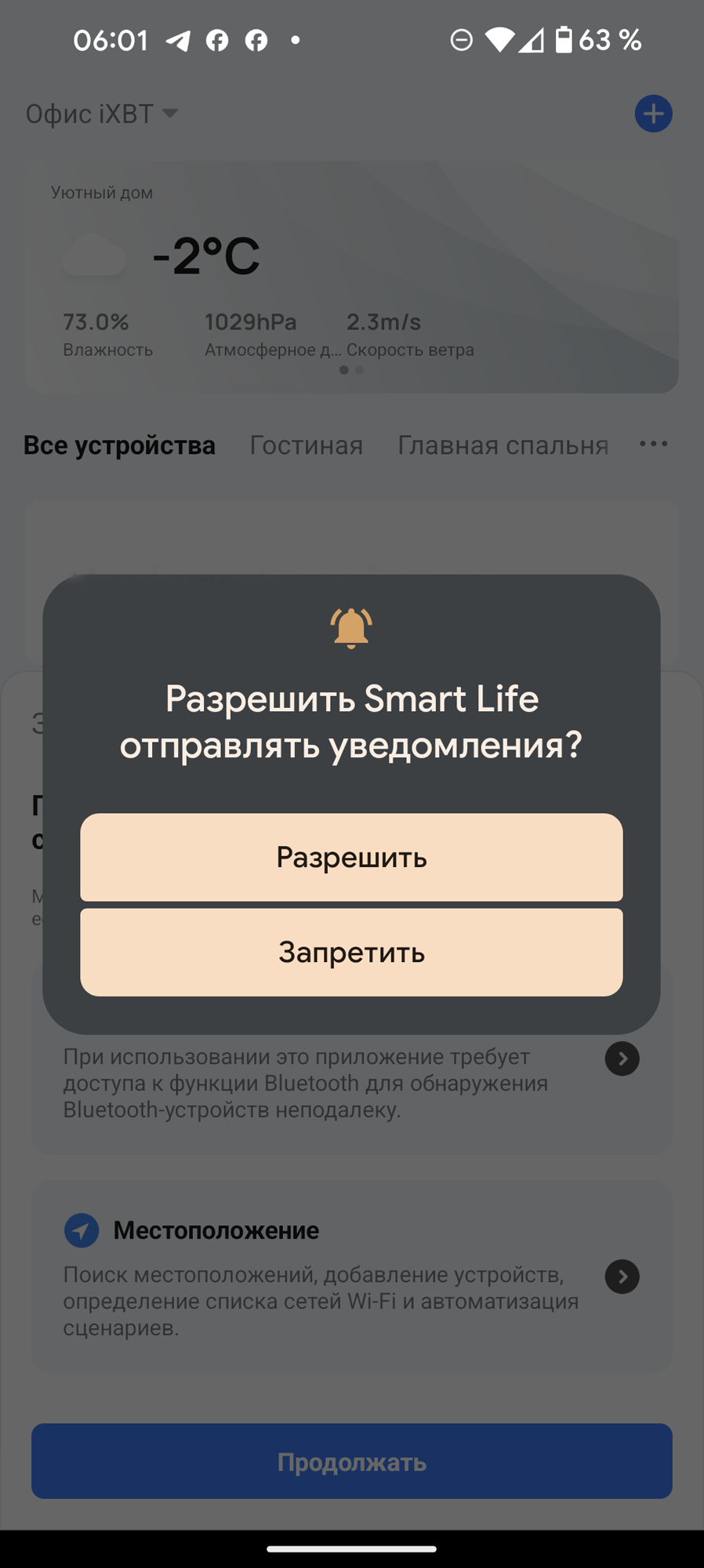 Для корректного сопряжения с климатическим комплексом следует предоставить приложению доступ к геоданным и к возможности обнаруживать устройства поблизости. Также Smart Life требует разрешения на отправку уведомлений.