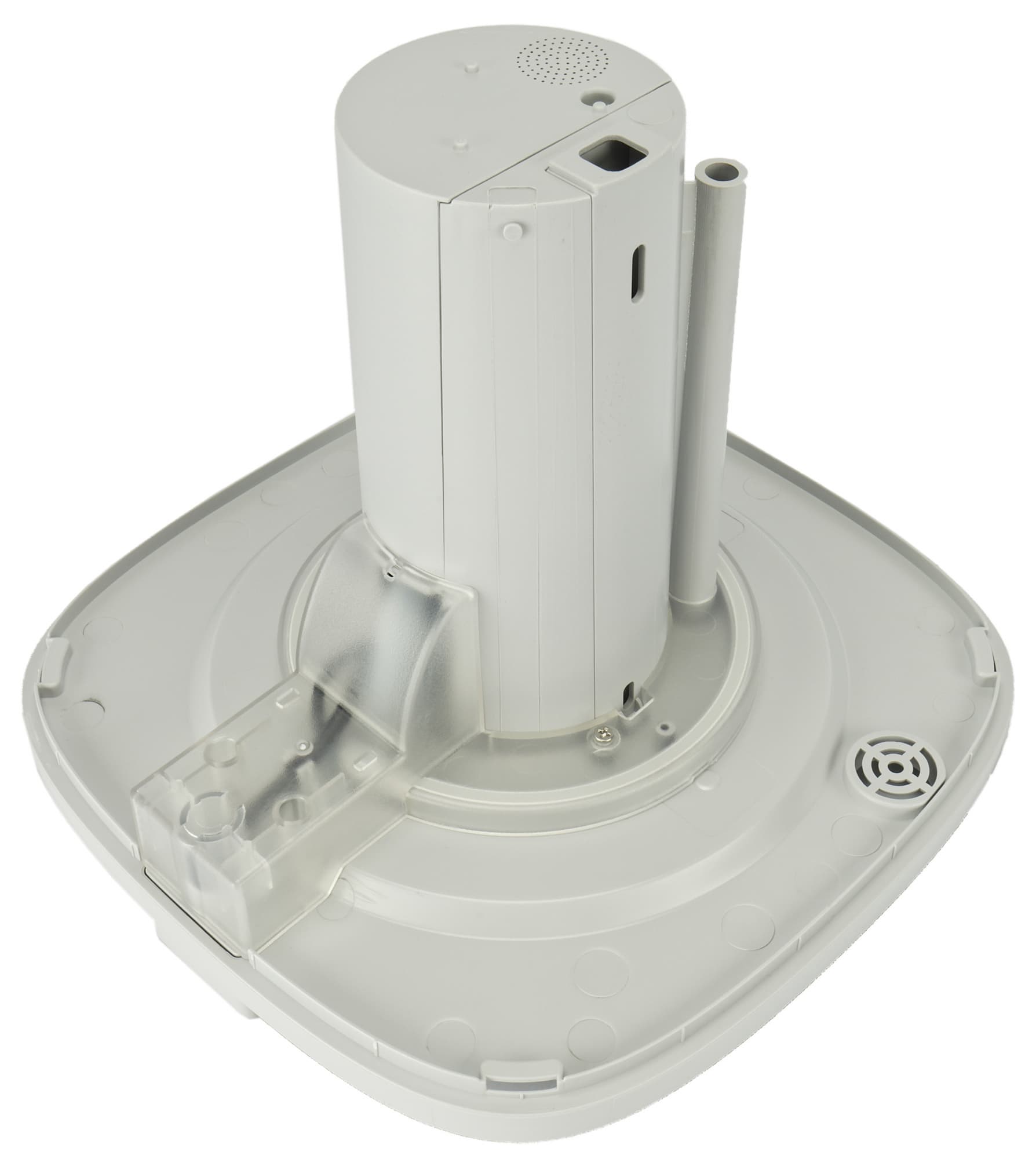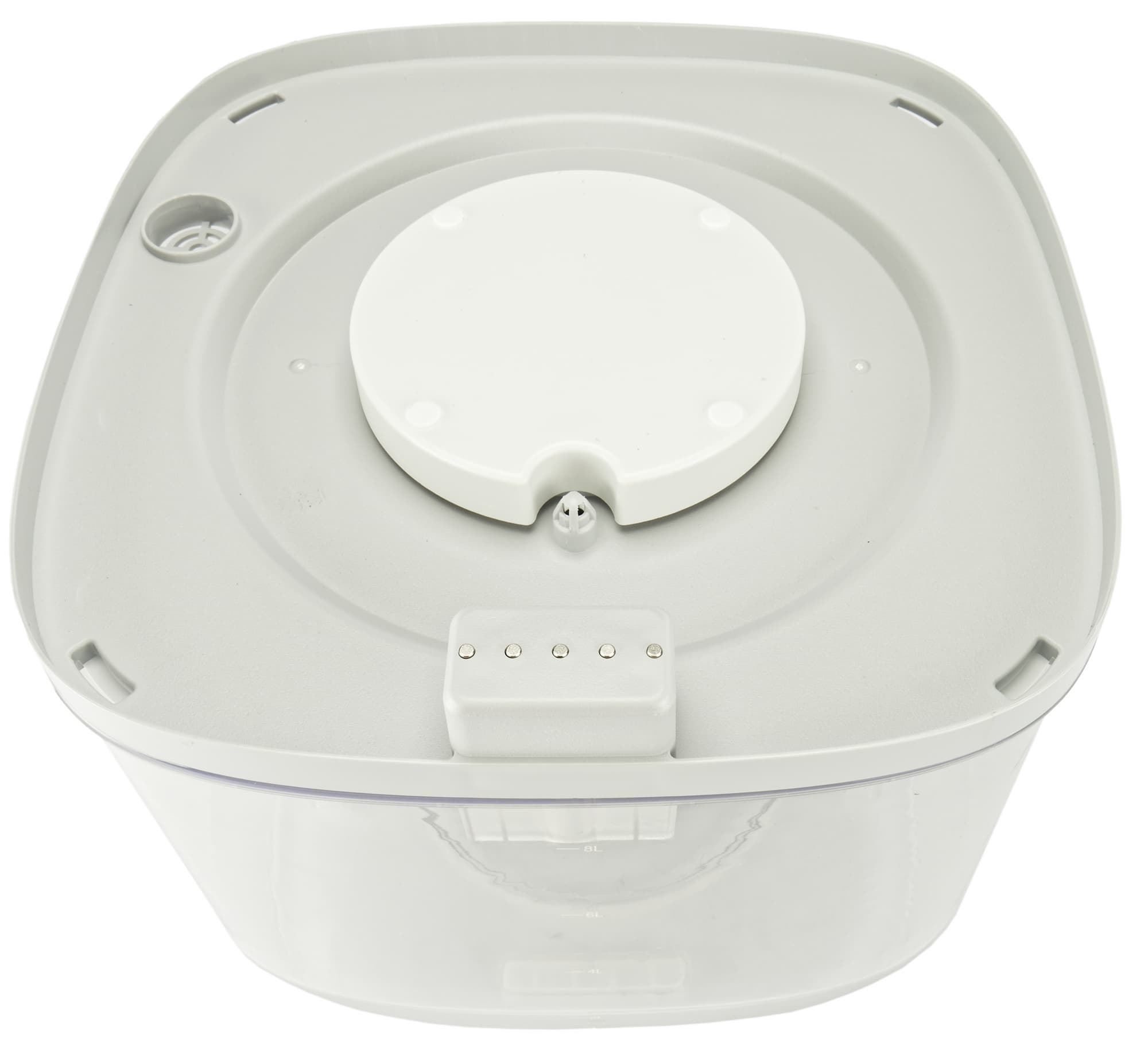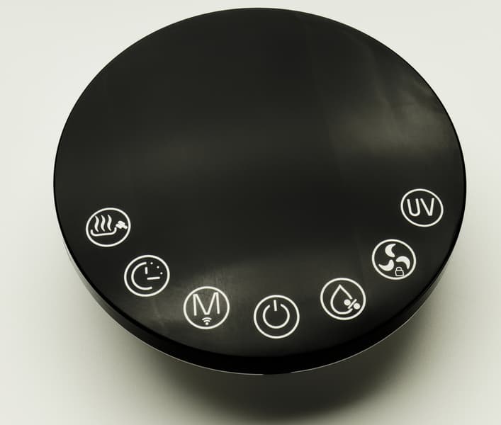 Верхняя крышка корпуса сделана вогнутой: на эту «тарелку» предполагается заливать воду при пополнении резервуара. Между ней и боковыми стенками по периметру располагается выпускное отверстие, через которое выходит очищенный и увлажненный воздух.