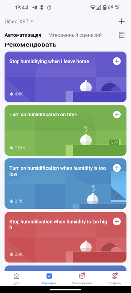 После настройки Garlyn AirClean V60 программа автоматически рекомендует несколько способов увеличить эффективность его использования. Здесь можно, к примеру, принудительно включить устройство, если влажность в комнате понизилась до заданного предела, или, наоборот, выключить его, когда этот параметр превысил комфортное значение.