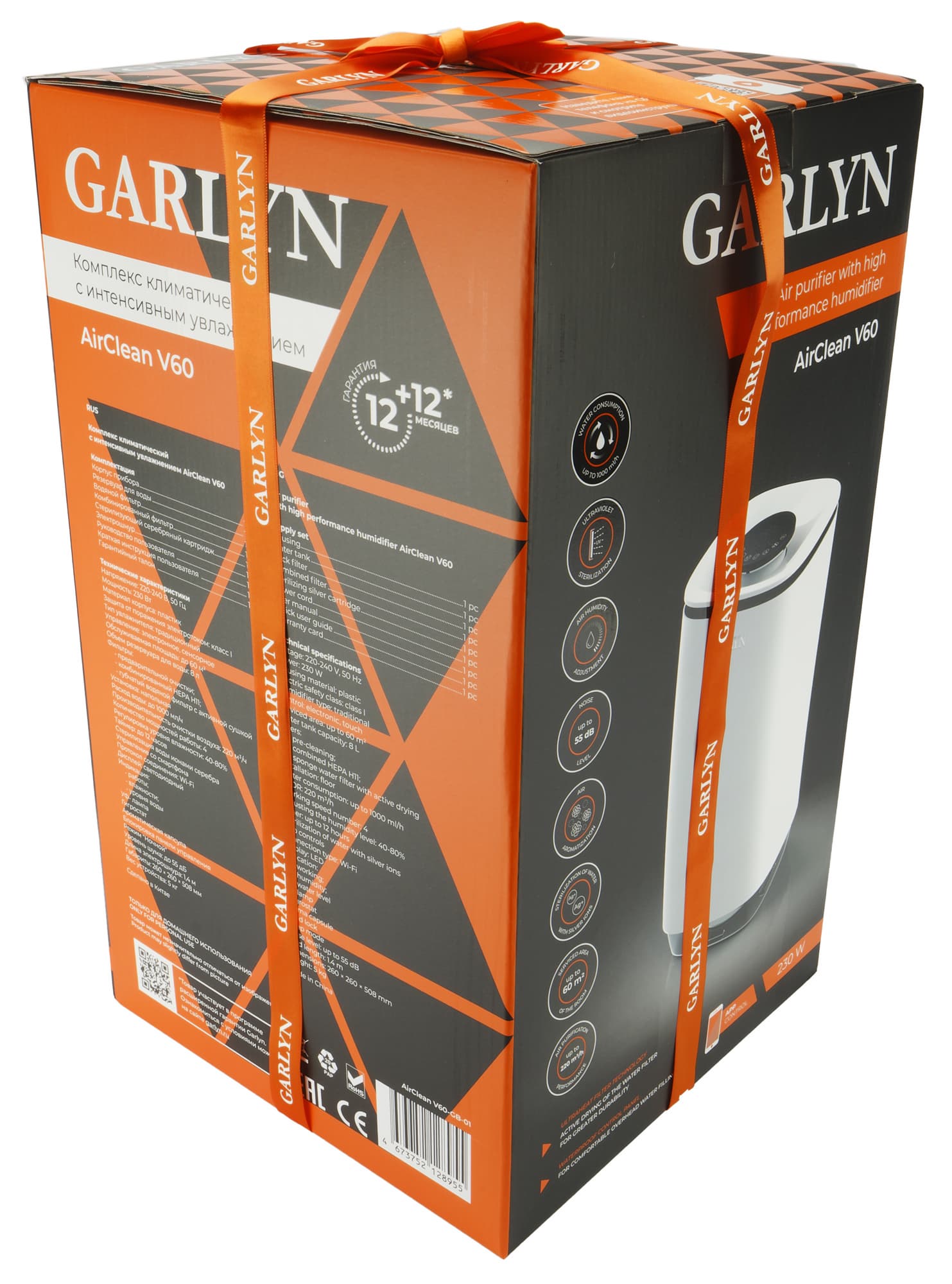 Климатический комплекс Garlyn AirClean V60 прибыл к нам на тестирование в фирменной картонной коробке, украшенной трогательным бантиком. На передней стороне производитель разместил изображение устройства и его основные достоинства. Среди них высокая (до 1000 мл/ч) производительность увлажнения, ультрафиолетовая стерилизация, уровень шума до 55 дБ, функция ароматизации воздуха, очистка воды ионами серебра и производительность очистки воздуха до 220 м³/ч. Рекомендованная площадь помещения для наилучшей работы — до 60 м²