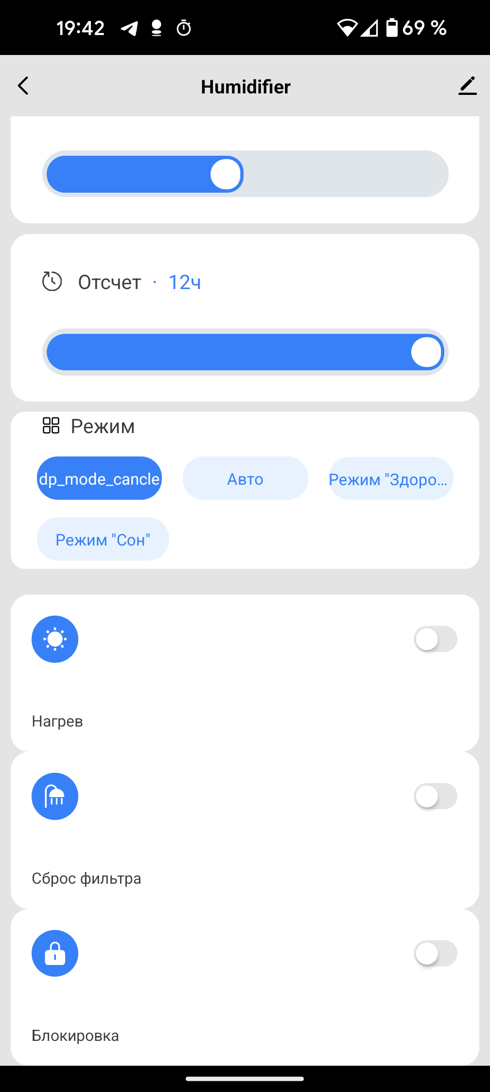 Слайдер «Отсчет» управляет таймером автоотключения. Под ним располагаются кнопки автоматических режимов «Авто», «Здоровье» и «Сон». Отметим небольшой косметический недочет: при вводе ручных установок здесь становится активной кнопка с малопонятной пользователю надписью «dp_mode_cancel». Ниже мы видим переключатели «Нагрев», «Сброс фильтра» (на самом деле имеется в виду режим автоматической очистки) и «Блокировка».