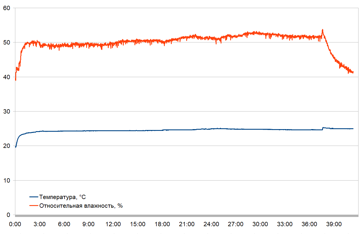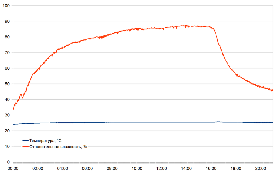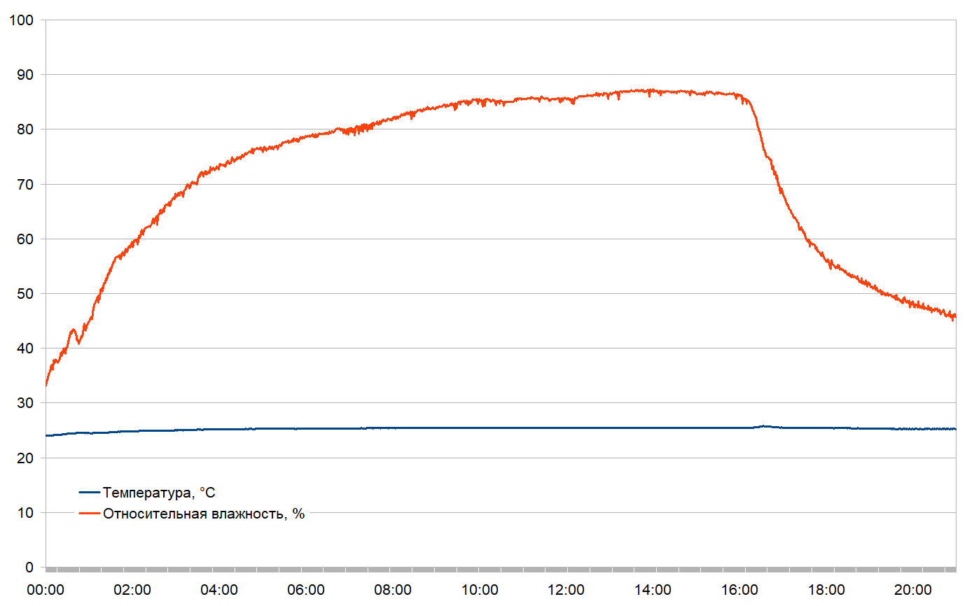 Для минимизации влияния внешних факторов мы плотно закрыли двери и окна. Между тестами помещение тщательно проветривали. Измерения температуры и влажности воздуха проводились автоматически, в комнате не было ни людей, ни животных.