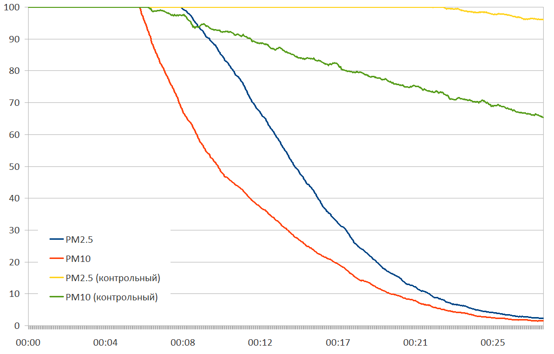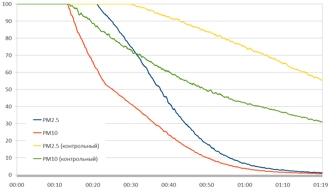 Чтобы сравнить скорость очистки воздуха с помощью прибора и естественным образом, мы повторили эксперимент, при этом отключили воздухоочиститель и посмотрели, с какой скоростью частицы осядут, если ничего с ними специально не делать. Полученные данные представляем в виде графика.