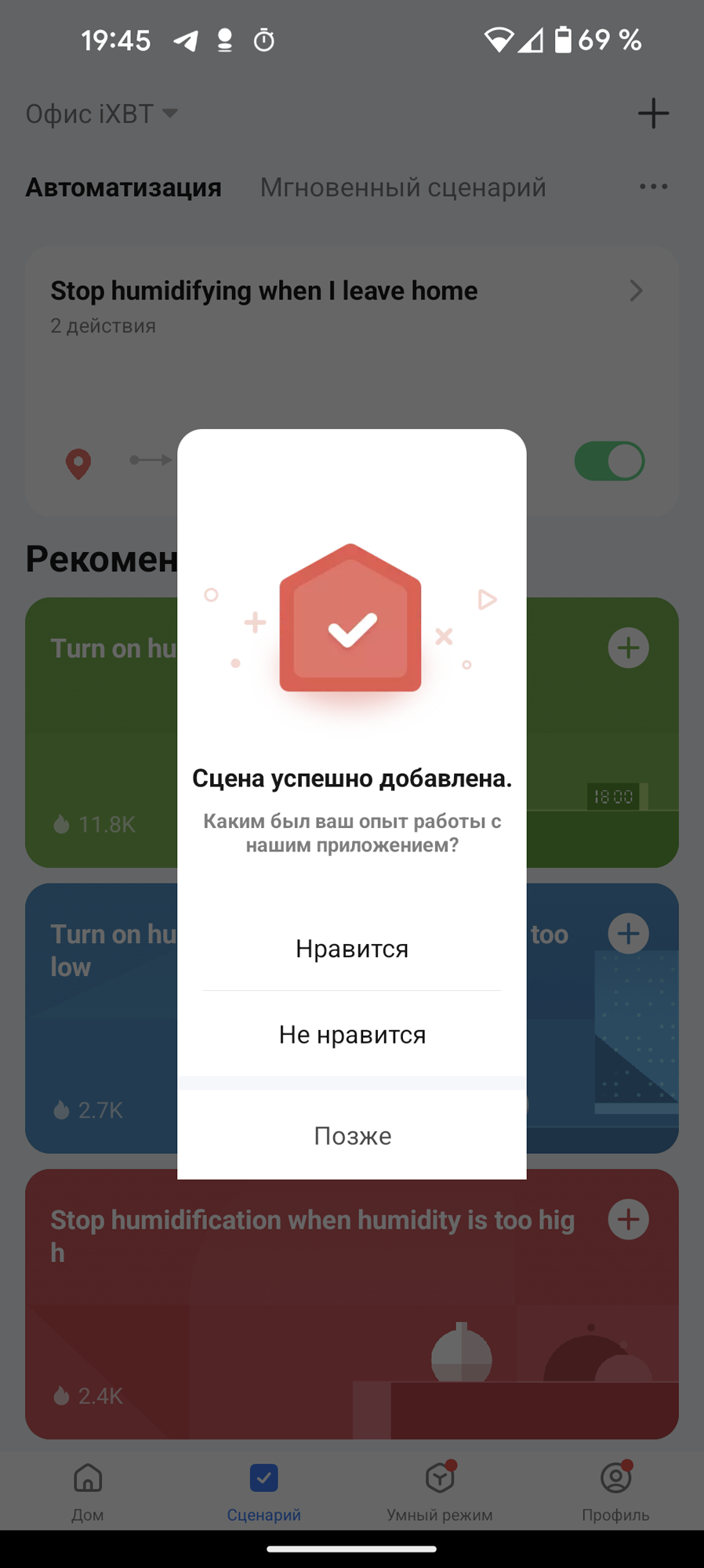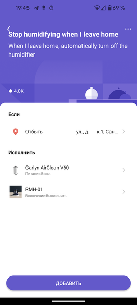 Приложение, как мы помним, использует информацию о местоположении пользователя: ее мы тоже можем использовать в нашем сценарии. На скриншоте выше создали правило, отключающее увлажнитель, если хозяин покидает помещение.