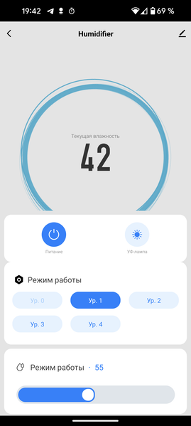 На ней мы видим крупные цифры, отображающие измеренную устройством относительную влажность. Ниже расположены кнопки управления. Слайдер «Режим работы» позволяет установить целевую влажность. Так же, как на панели управления, здесь можно выбрать значения от 40% до 80% с шагом в 5%.