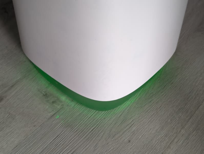 Полупрозрачный резервуар во время работы устройства подсвечивается зеленым и синим, а при возникновении затруднений (к примеру, при его опустошении) подсветка становится красной.