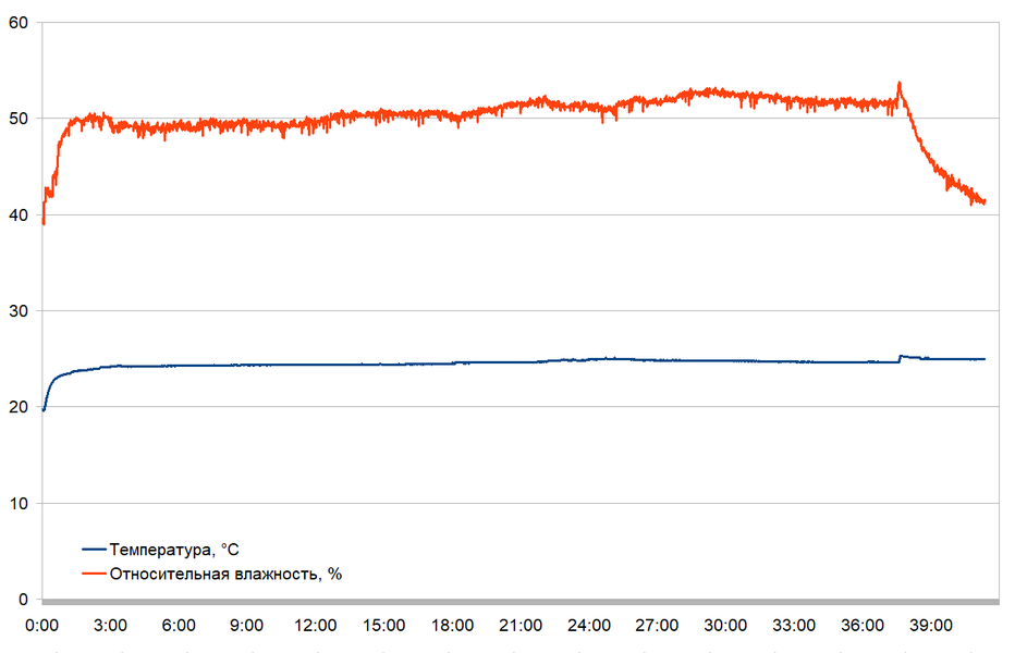 На «низких оборотах» увлажнитель улучшал климат в комнате в течение приблизительно 37 с половиной часов, удерживая влажность на уровне 51%-53%.
