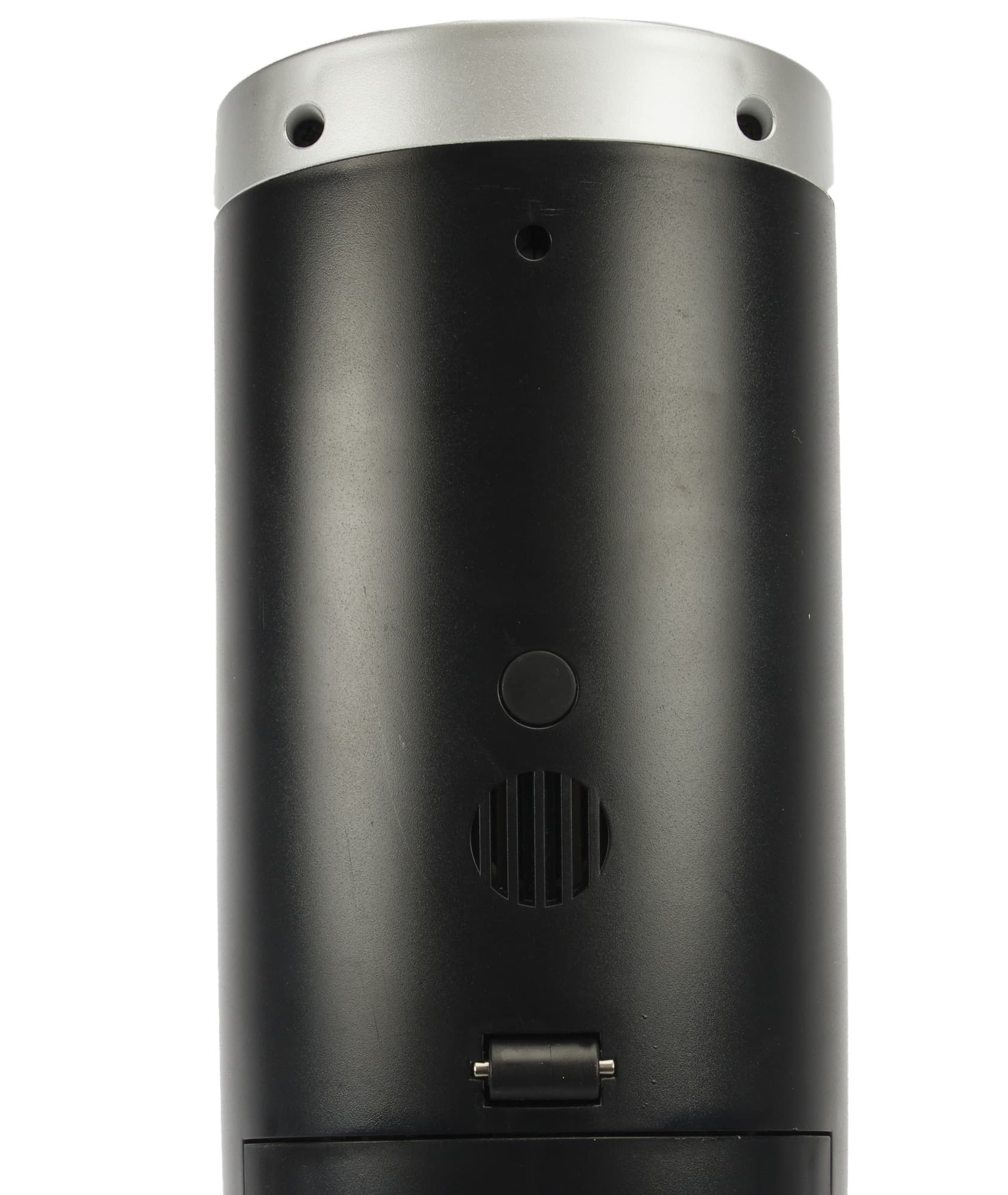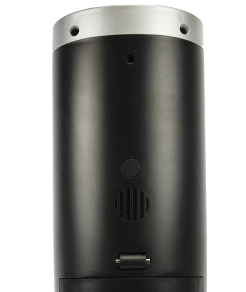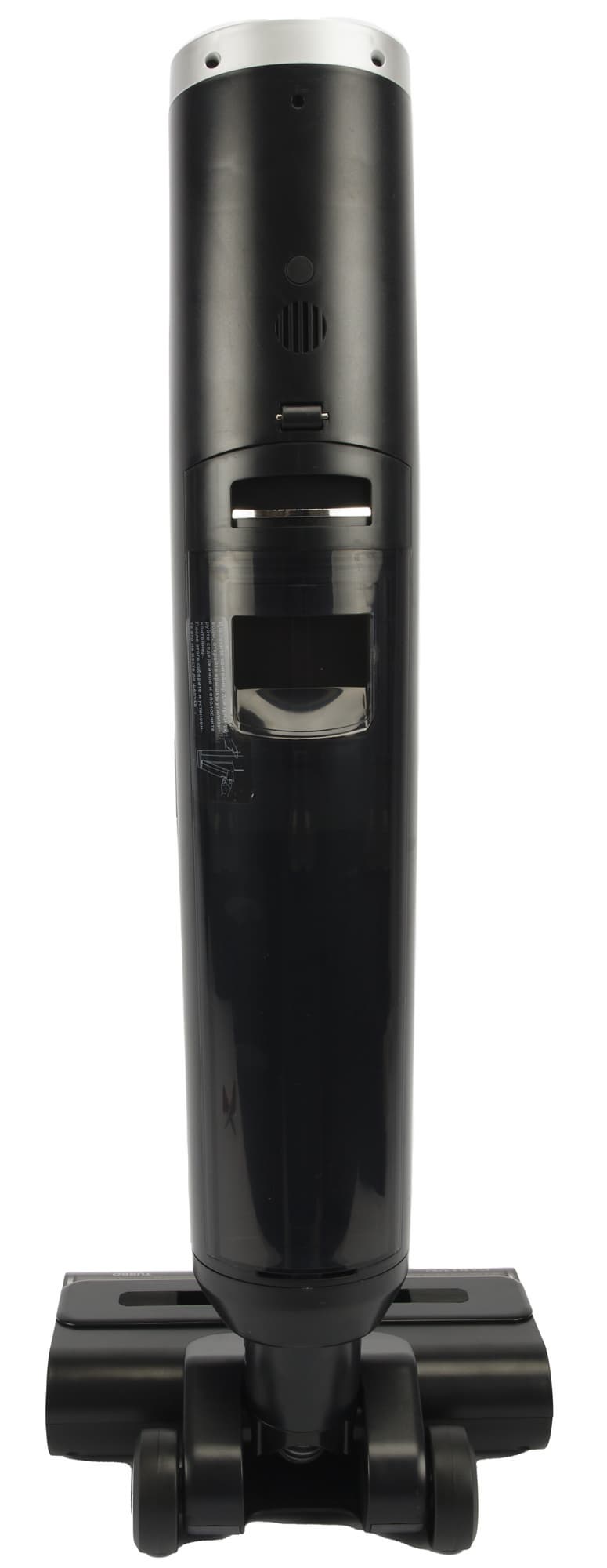 Спускаемся к наиболее интересной части: корпусу пылесоса. В основном блоке вытянутой цилиндрической или сигарообразной формы находятся резервуары для чистой и грязной воды, индикаторы, динамик, кнопка включения/отключения голосового помощника и колесико для горизонтальной уборки.