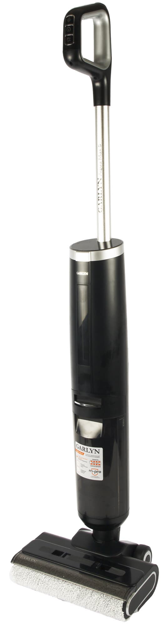 Управлять пылесосом Garlyn Aqua Max 5 можно с помощью кнопок, расположенных на ручке. Наглядным процесс делает светодиодный дисплей, который находится сверху на корпусе, и цветовой индикатор, идущий вертикально по центру лицевой стороны корпуса.