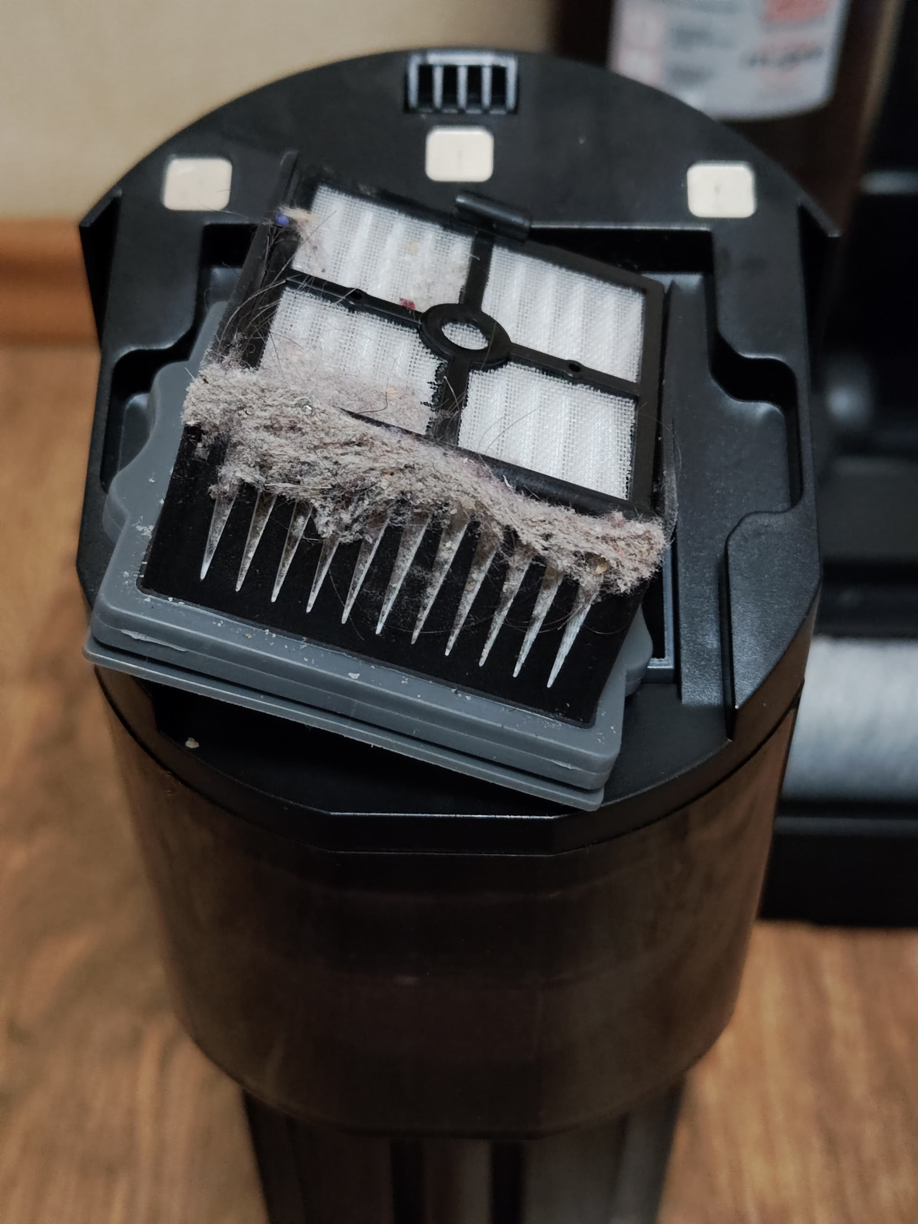 Контейнер для грязной воды следует извлечь, снять крышку, убрать из нее HEPA-фильтр, вылить или вытряхнуть содержимое, затем промыть под проточной водой и саму емкость, и крышку. Инструкция рекомендует очищать HEPA-фильтр по мере загрязнения, но не реже чем один раз в 30 дней. Для этого нужно открыть сетчатую крышку фильтра и хорошо промыть все детали под проточной водой.