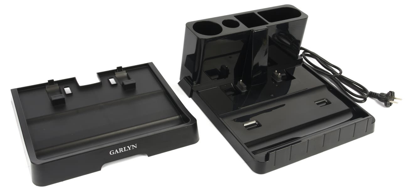 Зарядная станция представляет собой платформу размером 31×33 см высотой 5 см в самом низком месте и 15 см в самом высоком. В задней части, которая вероятнее всего будет придвинута к стене, мы видим подставку для хранения аксессуаров. Не очень понятно, какие аксессуары пылесоса в ней предполагается хранить, но зато там можно хранить вспомогательные для уборки предметы: тряпку, щетку. В подставке имеются четыре отсека разной формы и размеров.