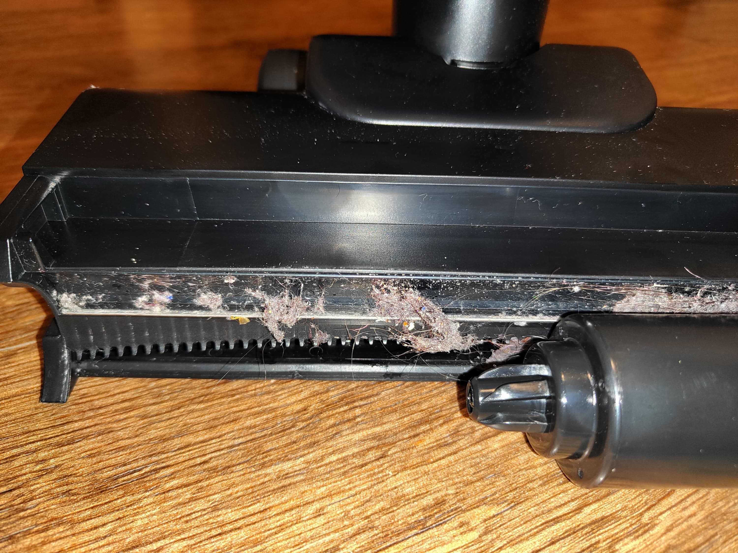 Пылесос отлично проявил себя при уборке линолеума и ламината, хорошо при мытье кафельного пола. А вот чистка ковра проходила утомительно: следовало несколько раз провести по одному и тому же месту, чтобы с участка были убраны волосы, нитки и мелкий мусор — их с низкого ворса ковра ролик щетки подхватывал неохотно.