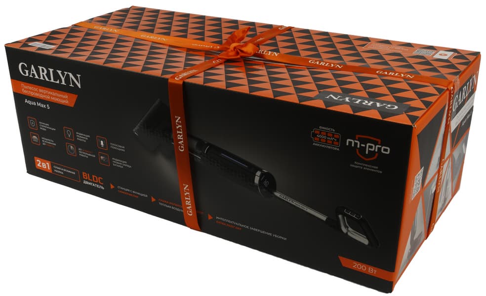 Garlyn Aqua Max 5 поставляется в двух коробках: транспортировочной и обычной, более живо оформленной. Внешняя, играющая исключительно защитную роль, изготовлена из неокрашенного плотного картона. На ней размещено схематичное изображение пылесоса и приведены его основные характеристики. Внутренняя, которая привычнее взгляду пользователя, выполнена в фирменном стиле Garlyn: темно-серый и оранжевый цвета, яркий геометрический узор сверху, несколько фотографий отдельных фрагментов прибора на одной боковой стороне и подробное описание характеристик — на другой. На фронтальной стороне видим фотографию пылесоса и перечень всех его функций и преимуществ.