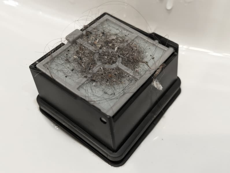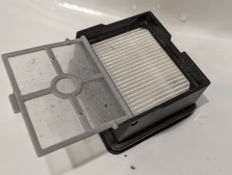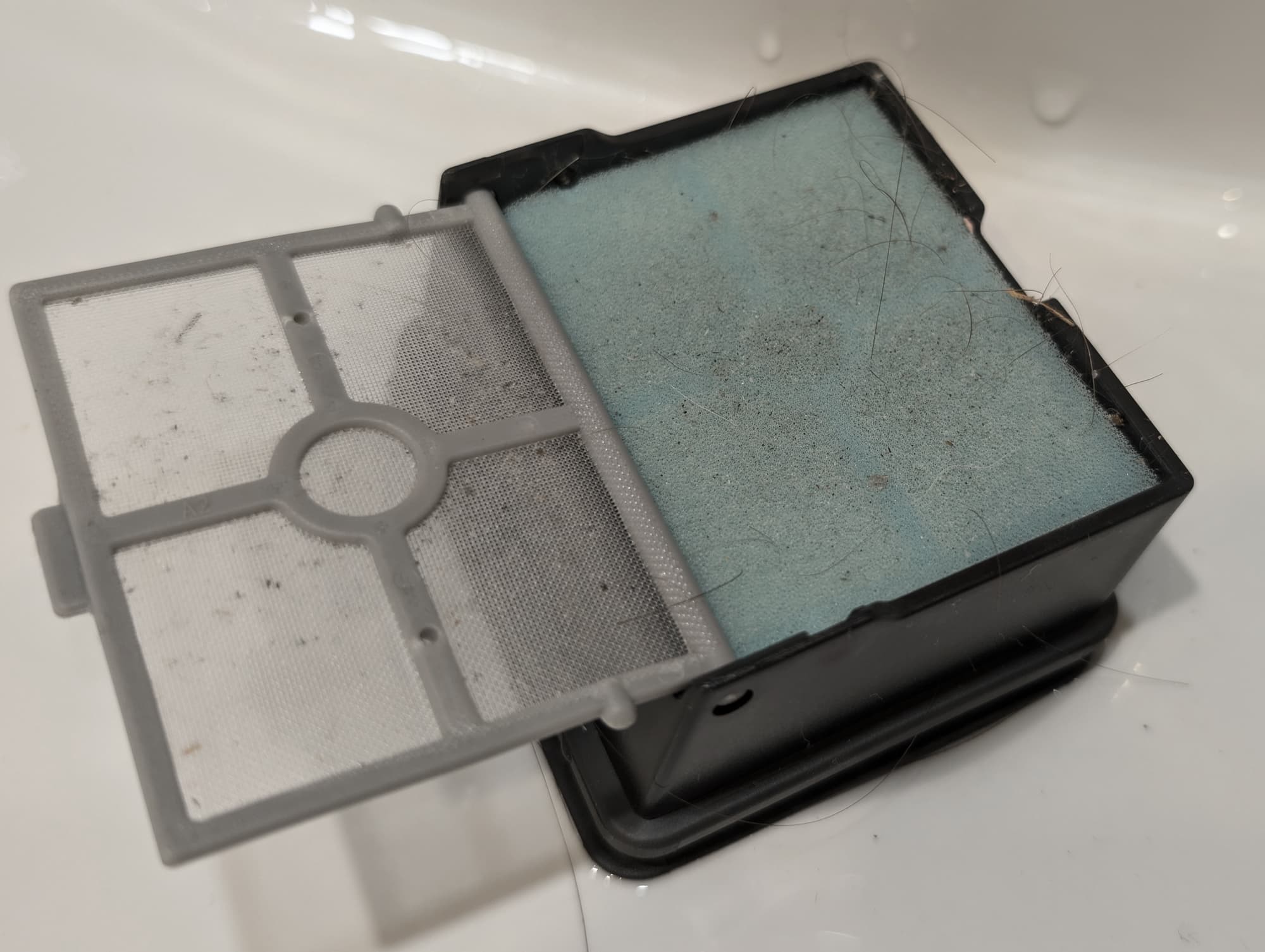 Предварительный поролоновый фильтр принимает на себя большую часть мелкой пыли: до HEPA-фильтра сквозь него долетает совсем немного.