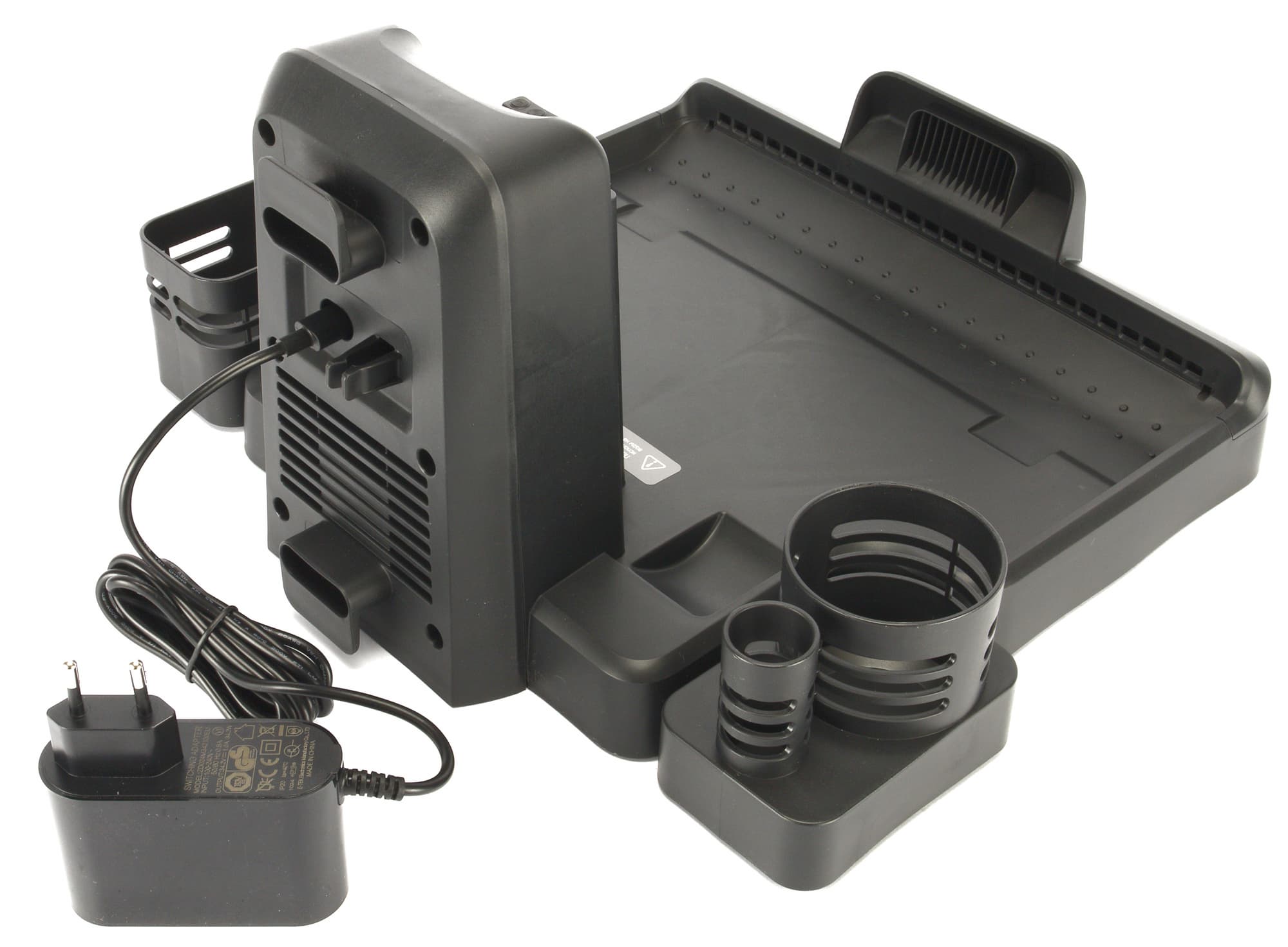 Базовая станция предназначена для самоочистки устройства, его зарядки и хранения. В ее плоской части есть небольшое углубление для сбора грязной воды при промывке ротора, а на вертикальном основании — два электрических контакта, обеспечивающие подключение пылесоса к источнику переменного тока.