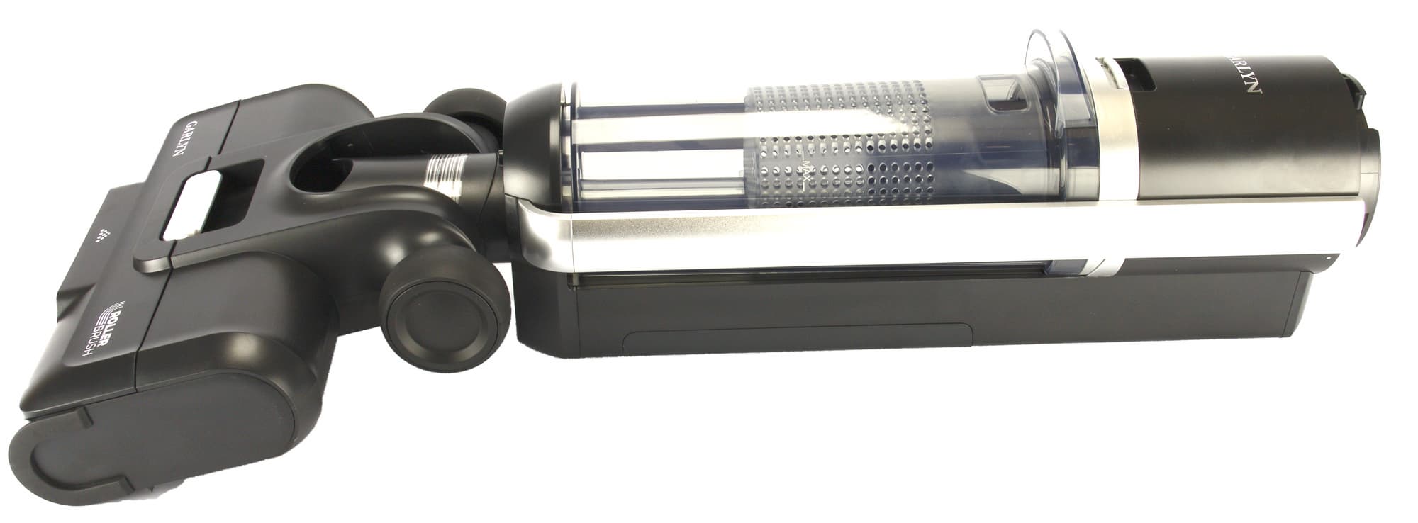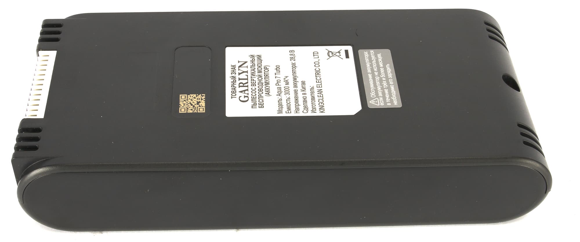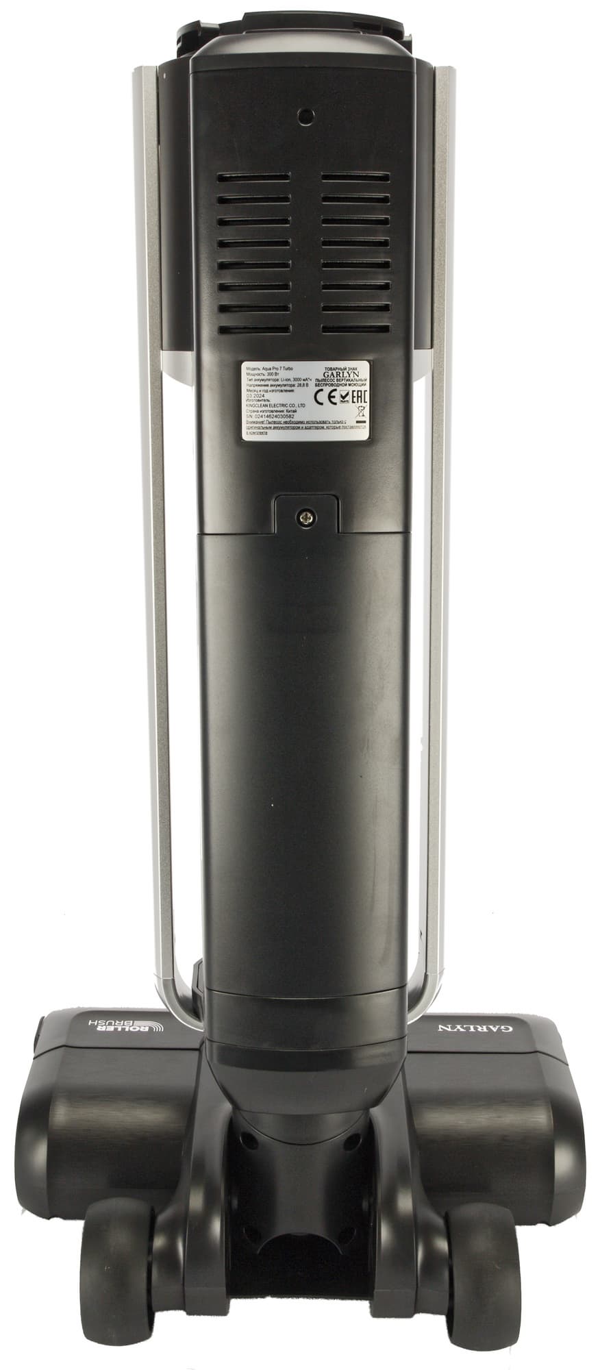 Конструкция Garlyn Aqua Pro 7 Turbo традиционна для моющих аккумуляторных пылесосов. В нижней части сигарообразного корпуса размещается контейнер для грязной жидкости с системой фильтров.