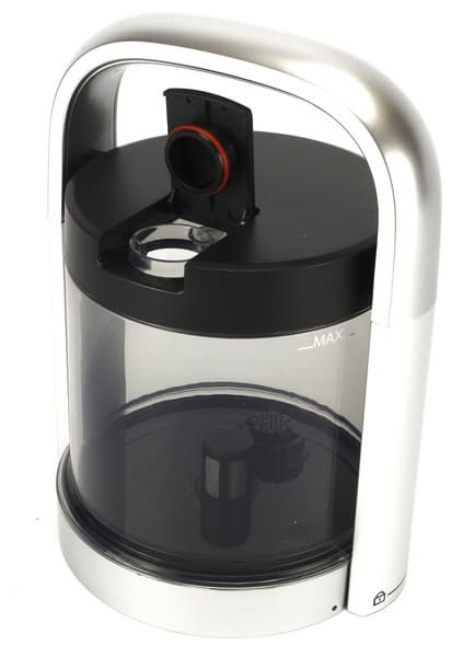 В верхней части бака — удобная ручка, за которую легко переносить и саму емкость, и весь пылесос. Для фиксации на моторном блоке резервуар нужно повернуть в направлении стрелки, нарисованной на корпусе. Держится он прочно и надежно: ручка вполне выдерживает вес конструкции.