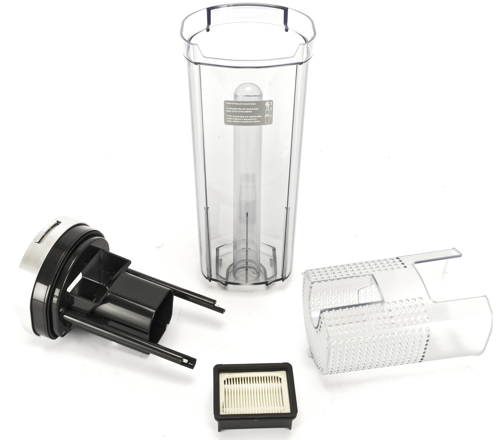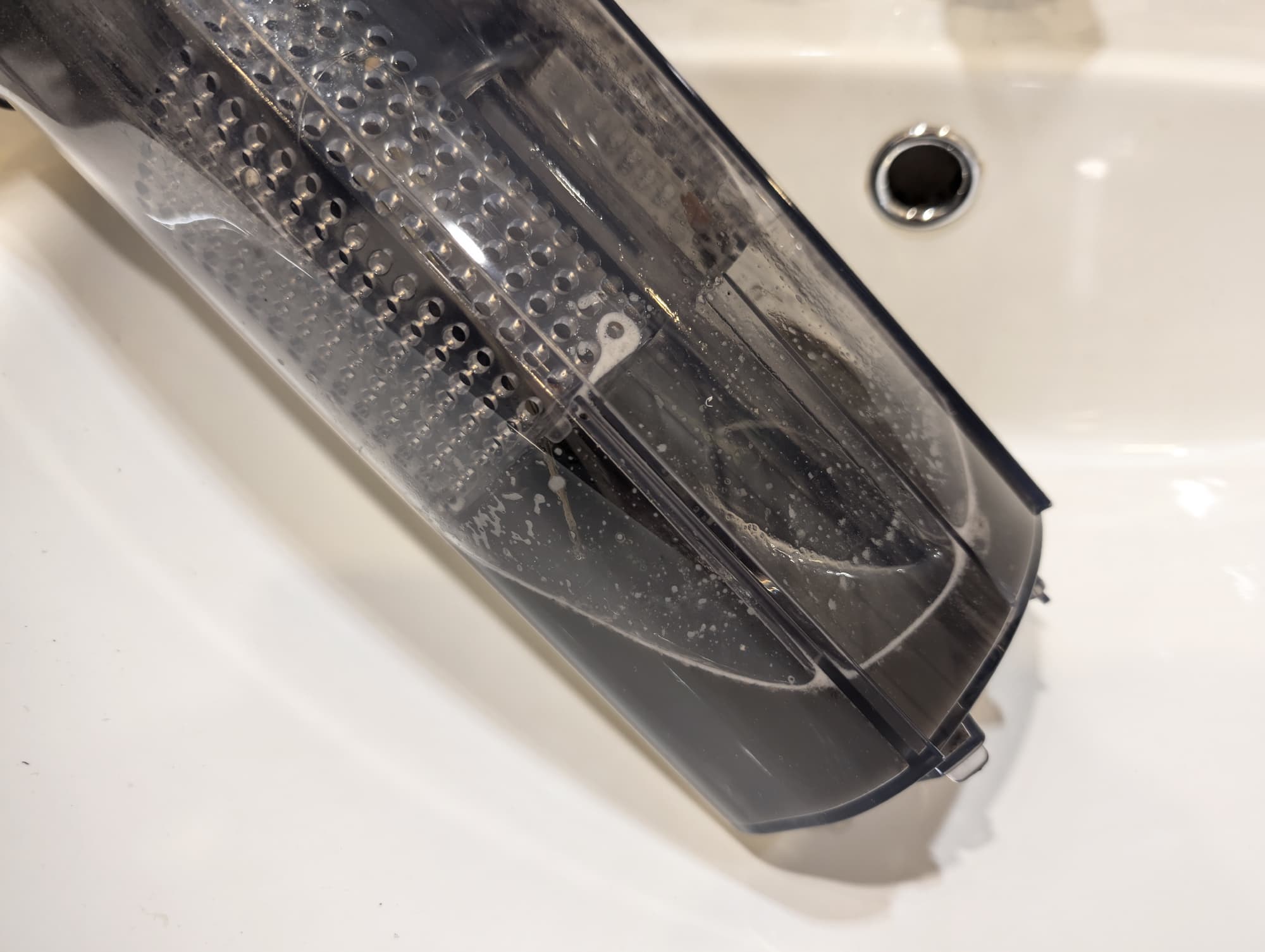 Контейнер для грязной воды и мусора сделан из прозрачного светло-серого пластика — это позволяет легко контролировать уровень жидкости.