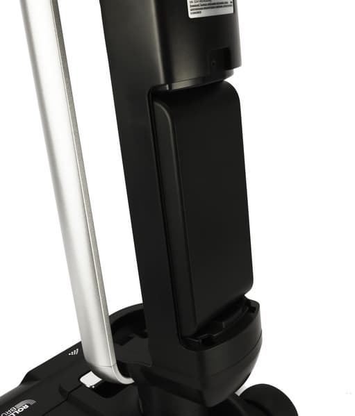 В вертикальном положении включенный пылесос становится на парковку, двигатель прибора автоматически отключается. Чтобы продолжить работу, нужно наклонить корпус, слегка придерживая насадку ногой.