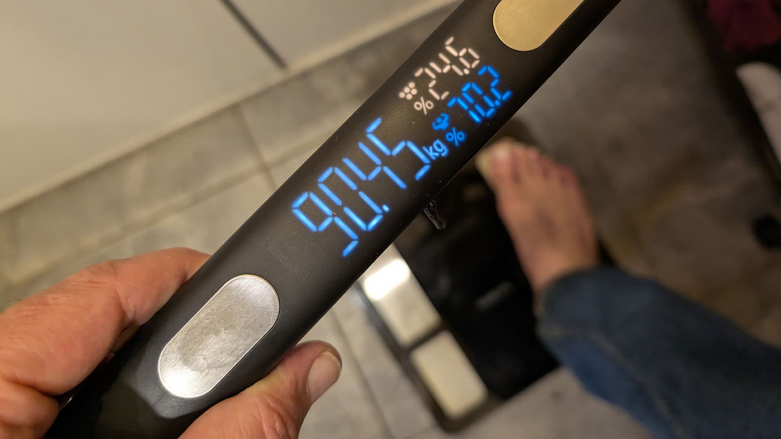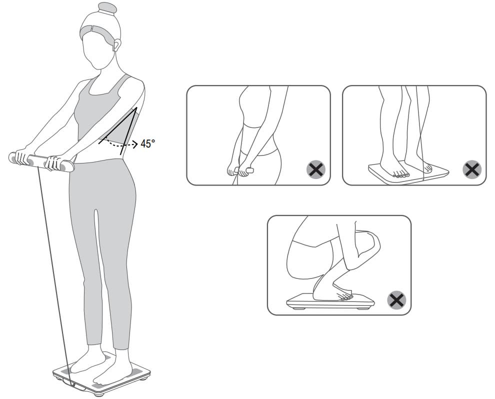 В приложении и руководстве описывается правильная поза при проведении измерений. Ручку весов следует плотно держать в обеих руках так, чтобы все четыре электрода были прижаты к пальцам: большим на одной паре контактов и остальными — на второй. Руки при этом нужно держать вытянутыми под углом приблизительно 45° к телу. Нельзя опускать руки, сгибать конечности и приседать. Во время измерений желательно сохранять полную неподвижность.