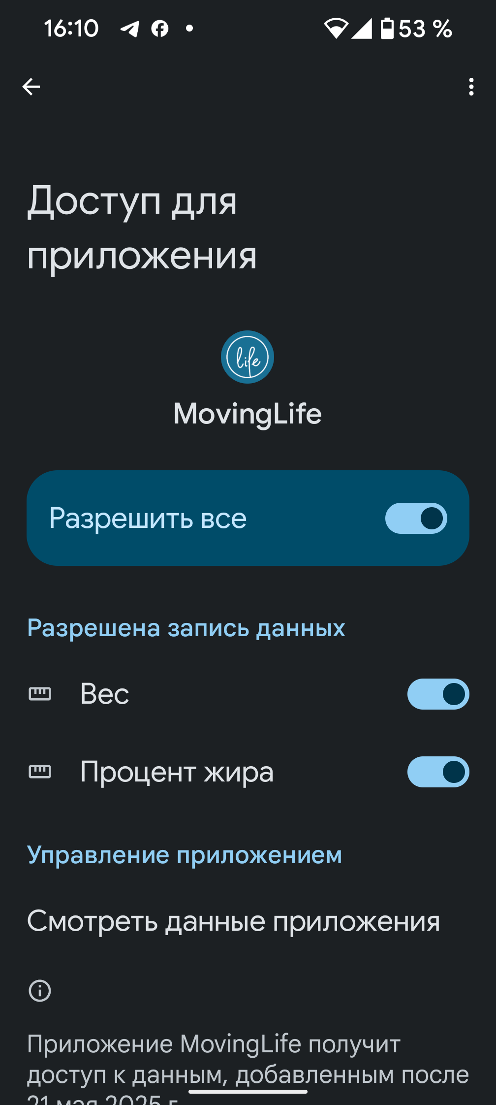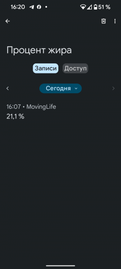 Для экспорта в сторонние приложения мы, разумеется, должны разрешить MovingLife обмениваться результатами измерений с системой. К сожалению, регулярно используемый нами Google Fit умеет принимать из других приложений только информацию о весе и проценте жира в организме — но и это весьма полезно.